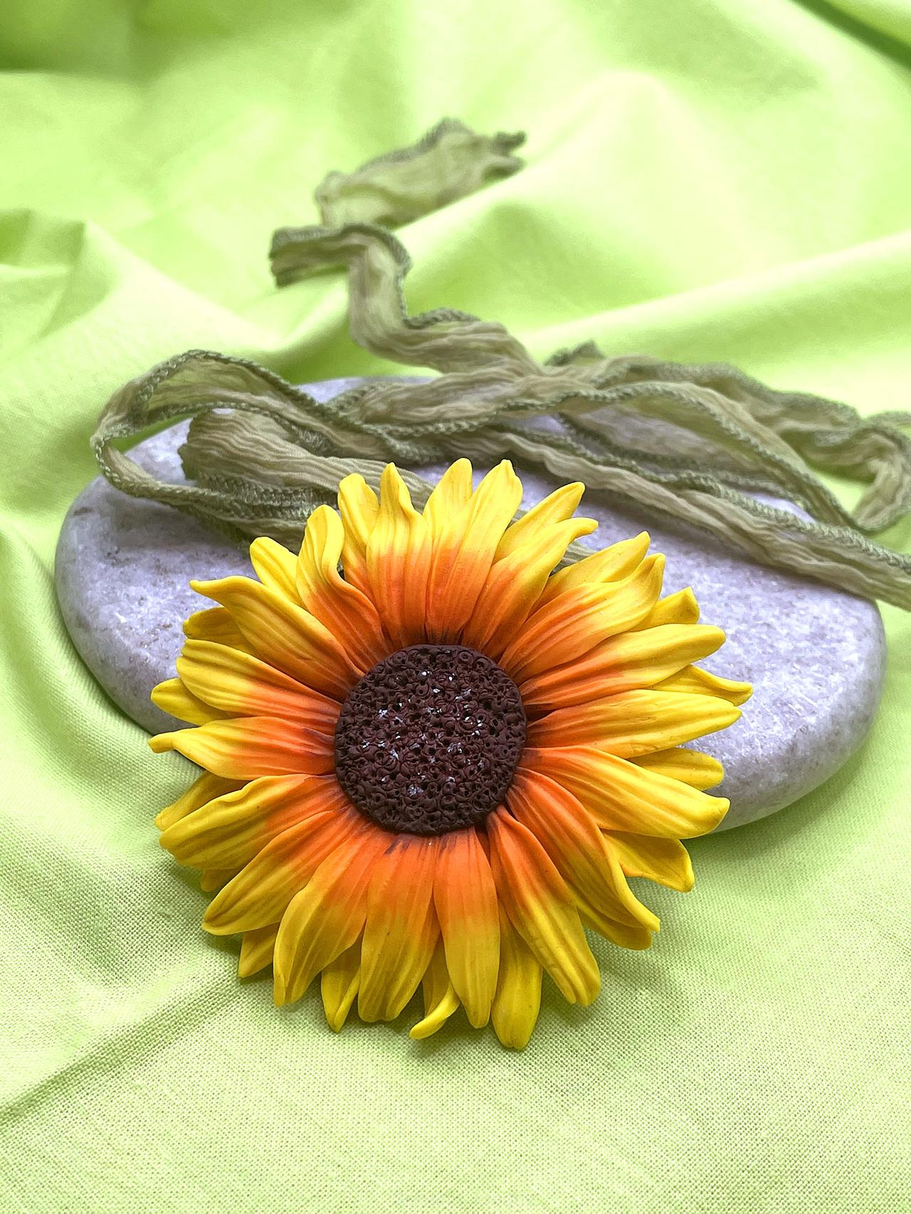 Elegantní náhrdelník, veselá slunečnice detailně vymodelovaná z polymerové hmoty, zavěšená na zelené hedvábné šňůrce.
