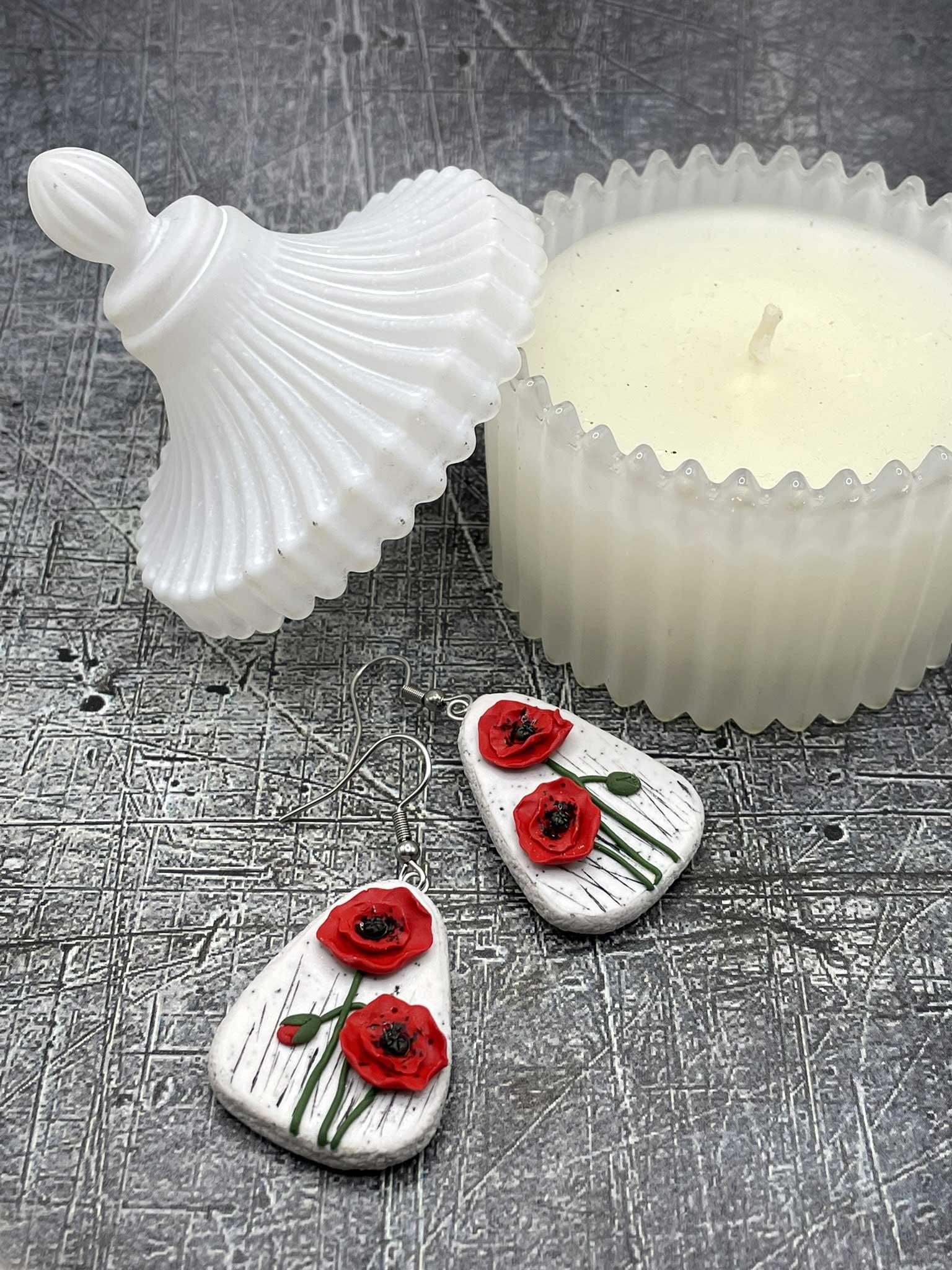 Elegantní náušnice z polymerové hmoty. Květy máku jsou vymodelovány tak, že vystupují z podkladu. Komponenty jsou z chirurgické oceli.