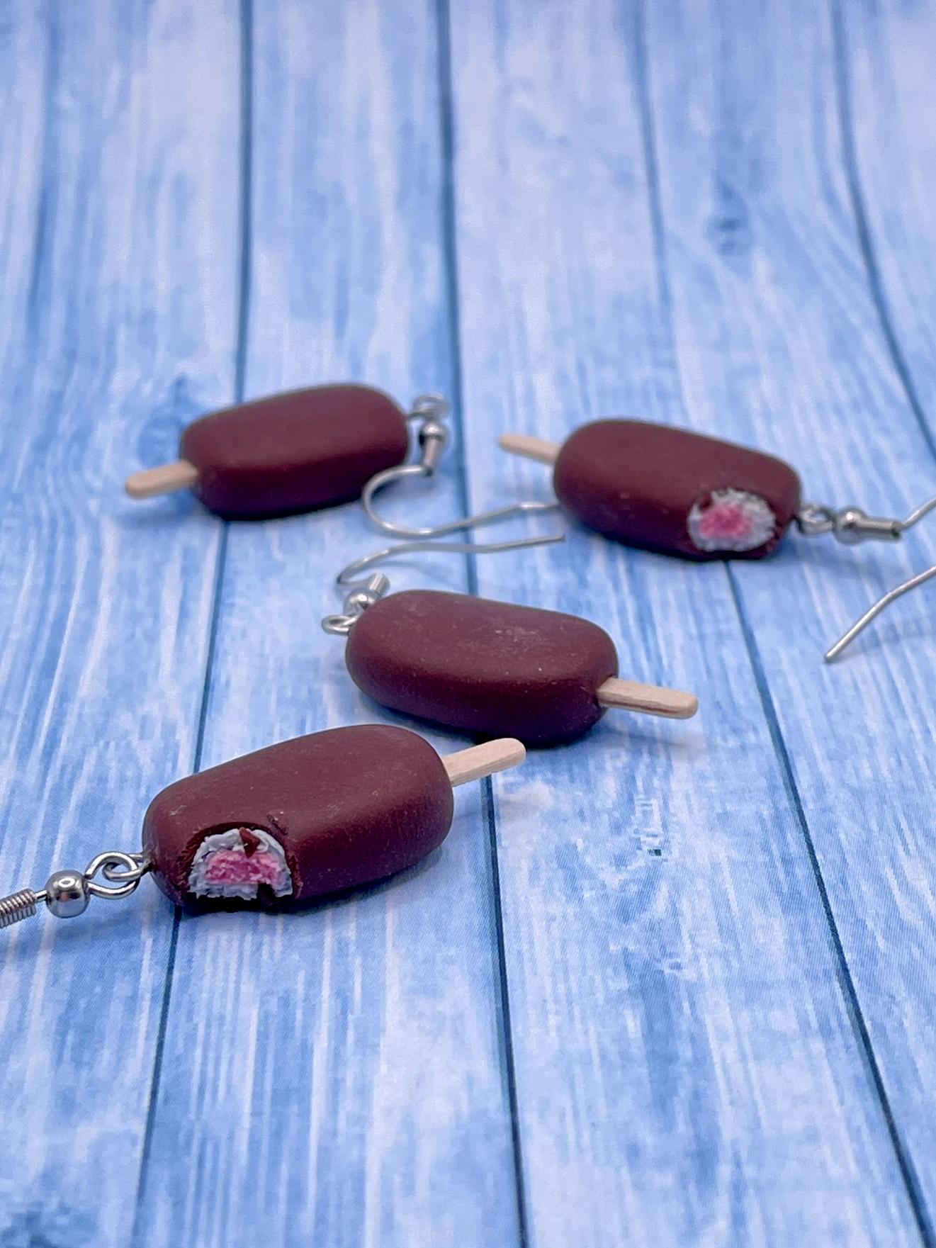 Ručně modelované náušnice, které vypadají jako právě vytažené z mrazáku. Jahodový vnitřek, křupavá čokoládová poleva a jako třešnička na dortu – opravdový dřevěný klacík!