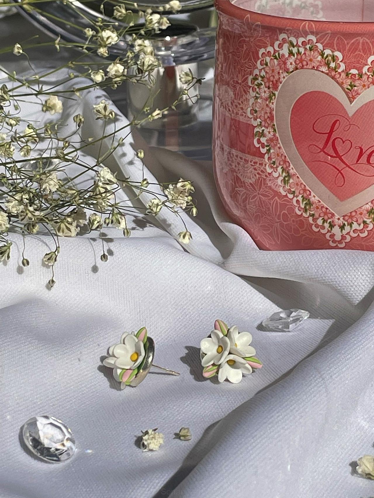 Něžné náušnice s kvítky, každý kvítek je pečlivě vymodelován z bílé a světle růžové polymerové hmoty.