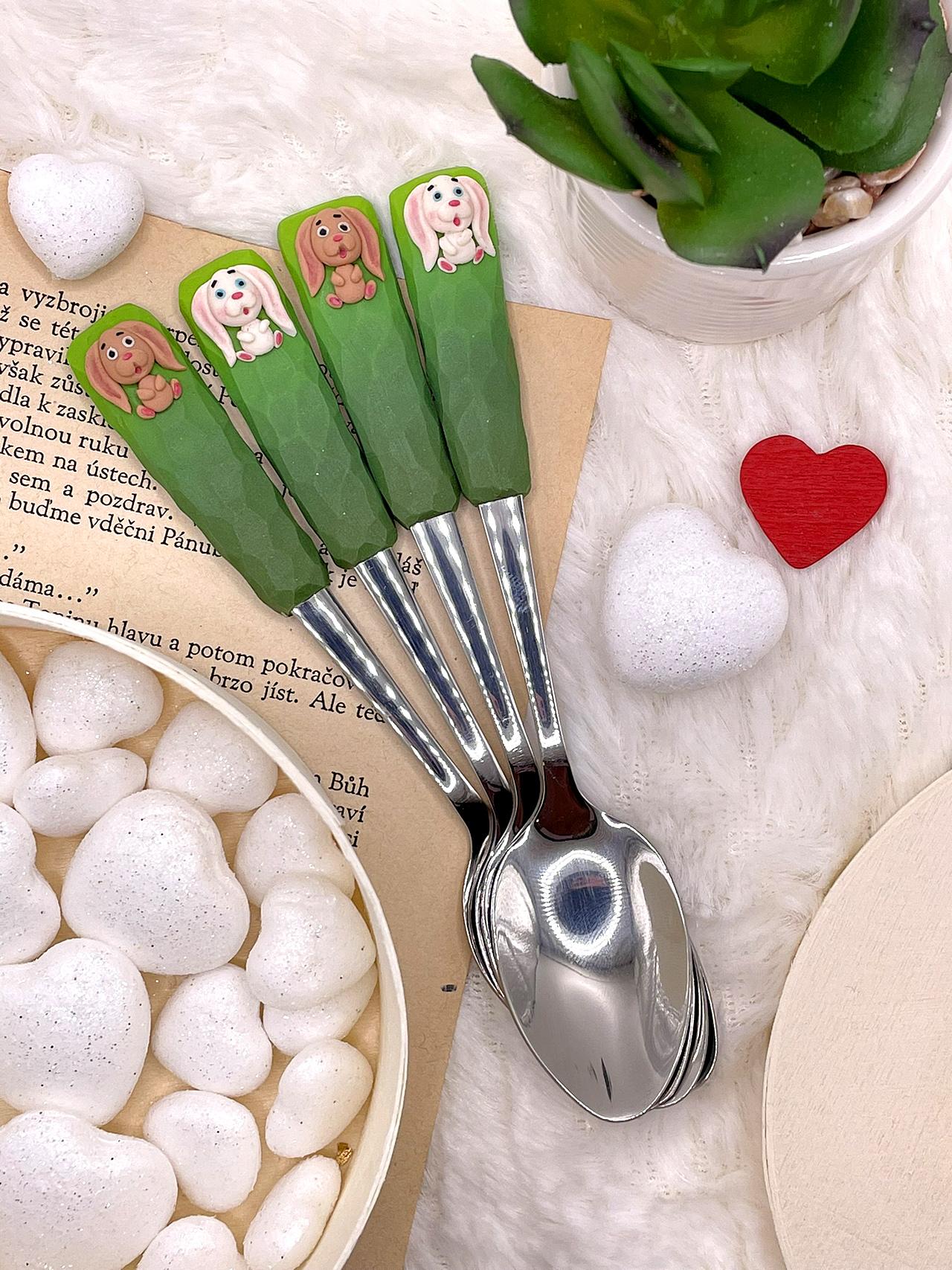 Čajová lžička zdobená polymerem v odstínech zelené s ručně vymodelovaným zajíčkem.