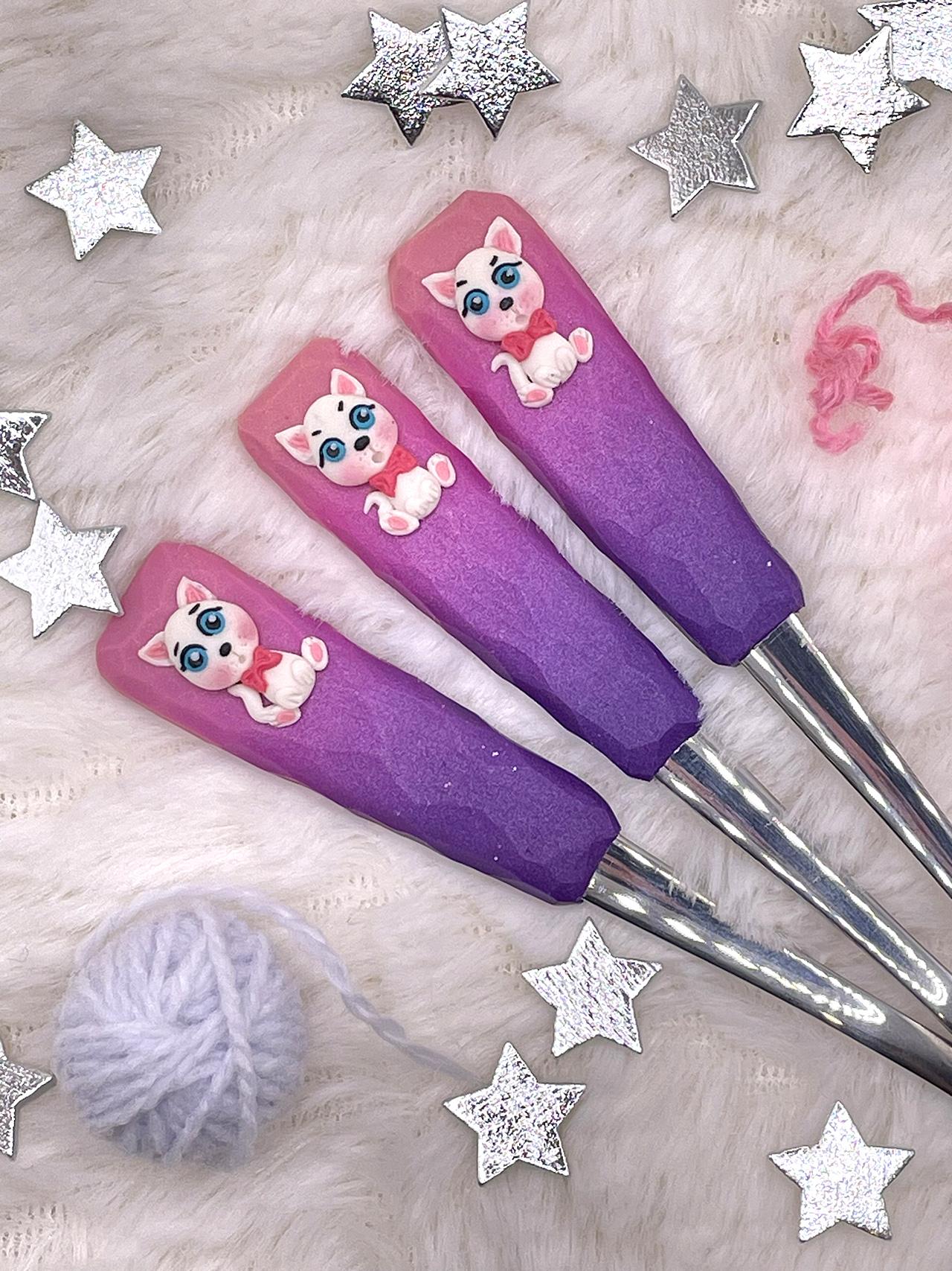 Čajová lžička zdobená polymerem v odstínech fialové a tmavě růžové s ručně vymodelovanou kočičkou.