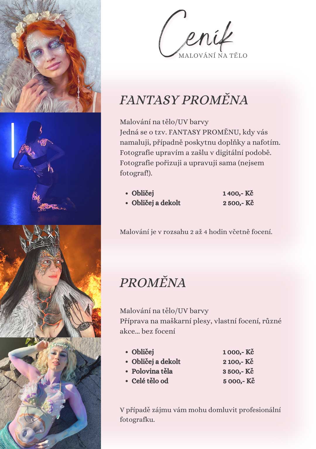 Body painting, neboli malování na tělo, přináší nekonečné možnosti tvarů, vzorů a motivů. Je to umělecká technika, která promění lidské tělo v živé plátno. Mohu vás proměnit na fiktivní postavy, ozdobit abstraktními vzory i obrazy.