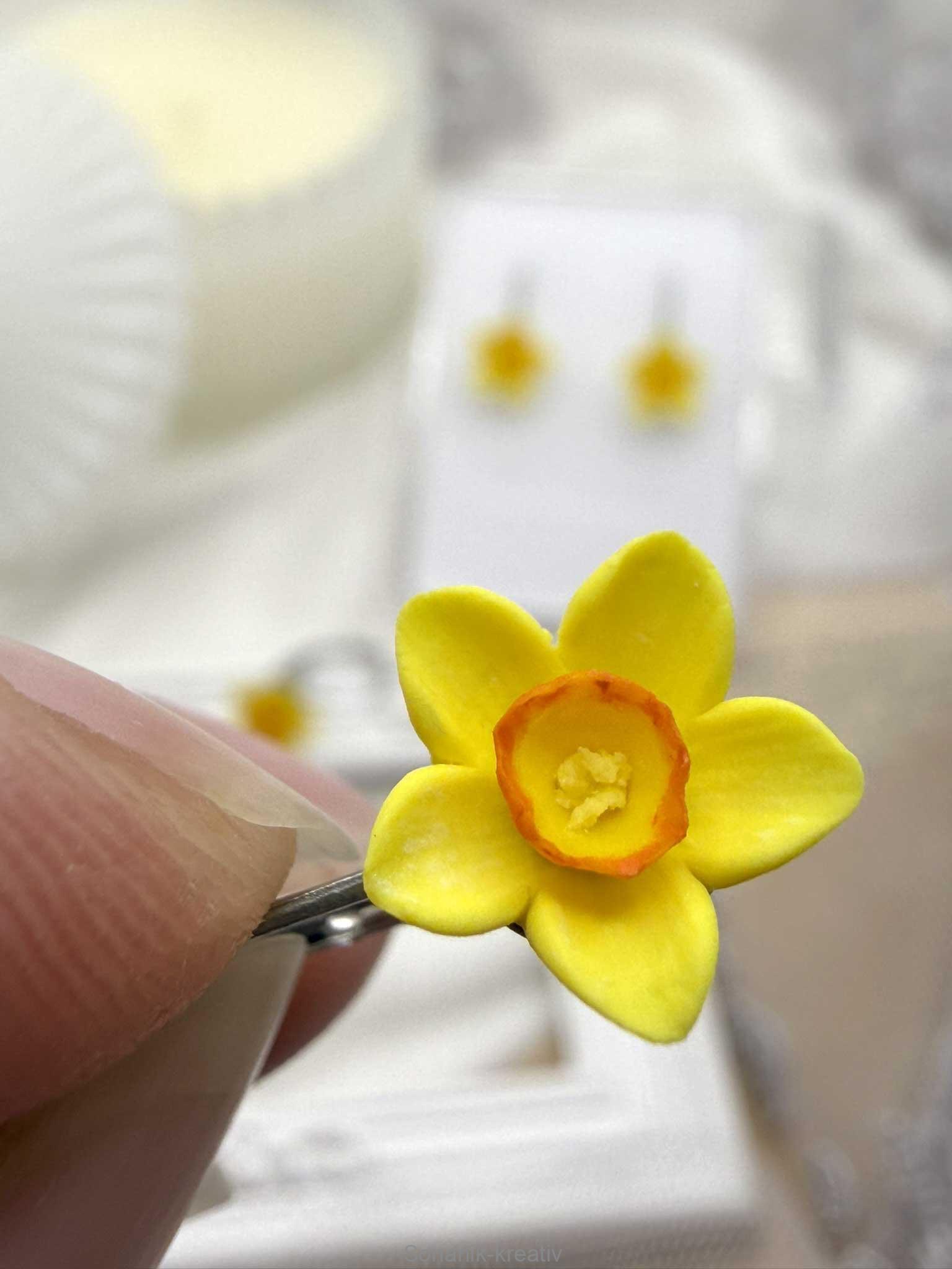 Tyto visací náušnice zdobí ručně modelované květy narcisek, propracované do posledního detailu. Sytější žlutý tón dodává šperku živost, zatímco jemné domalování zvýrazňuje strukturu květu a jeho přirozenou krásu. Náušnice jsou lehké, příjemné na nošení a snadno doladí každodenní i slavnostnější outfit.