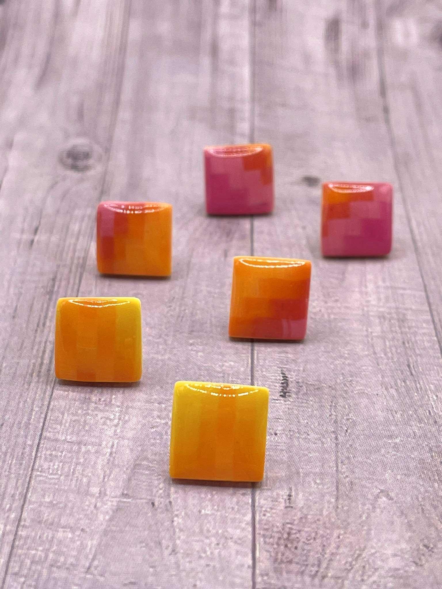Stylové náušnice z polymerové hmoty ve tvaru malých čtverečků, technika Bargello, zalité pryskyřicí.