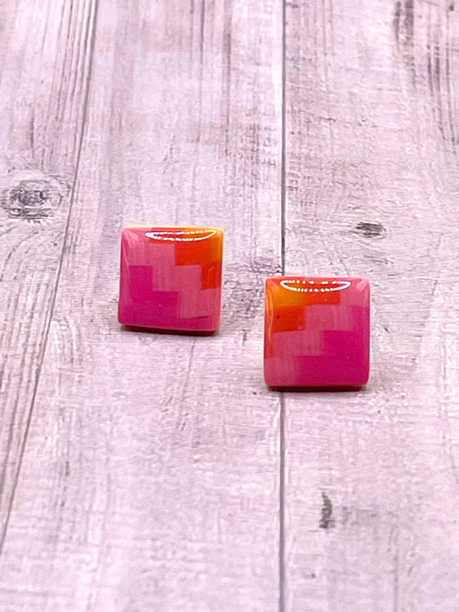 Stylové náušnice z polymerové hmoty ve tvaru malých čtverečků, technika Bargello, zalité pryskyřicí.