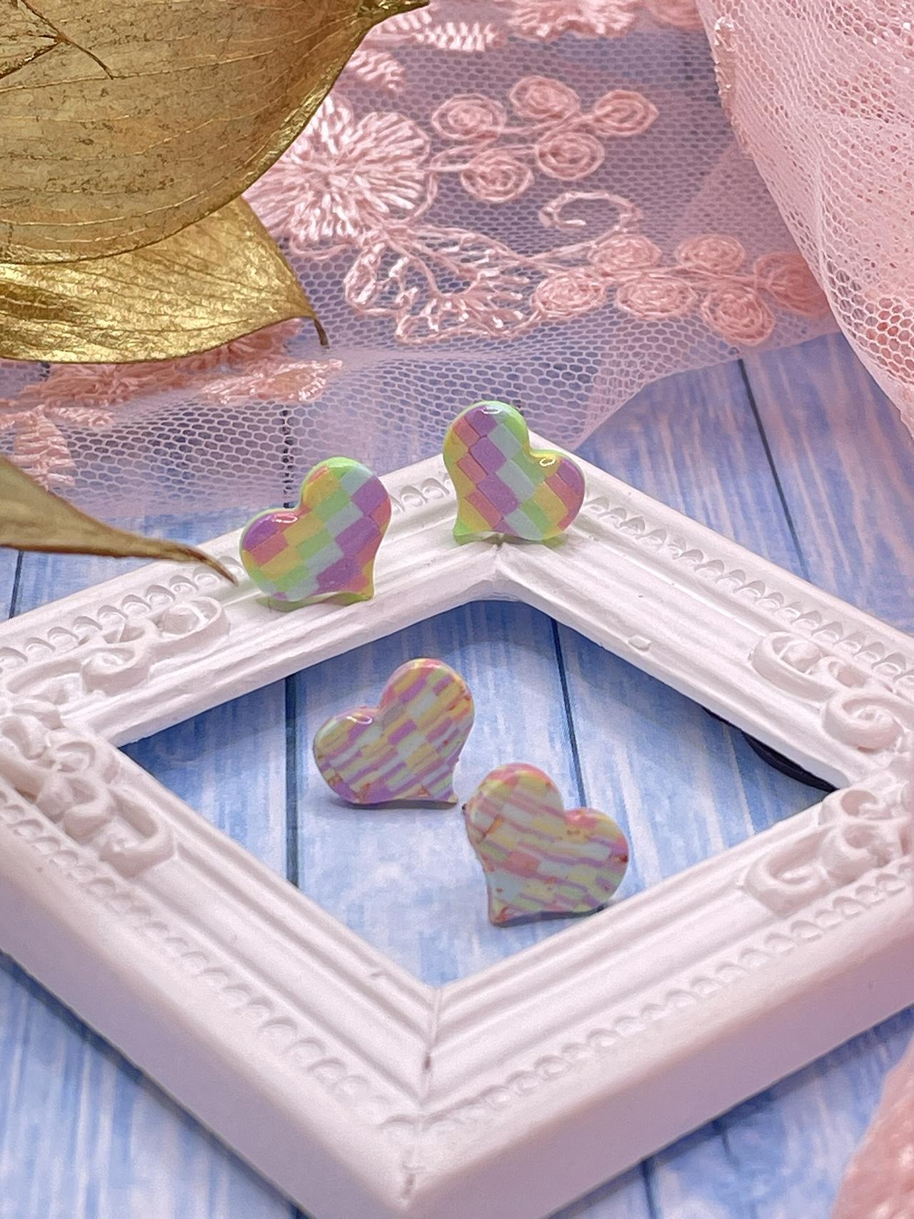 Stylové náušnice z polymerové hmoty ve tvaru malých srdíček, technika Bargello, metalický povrch, zalité pryskyřicí.