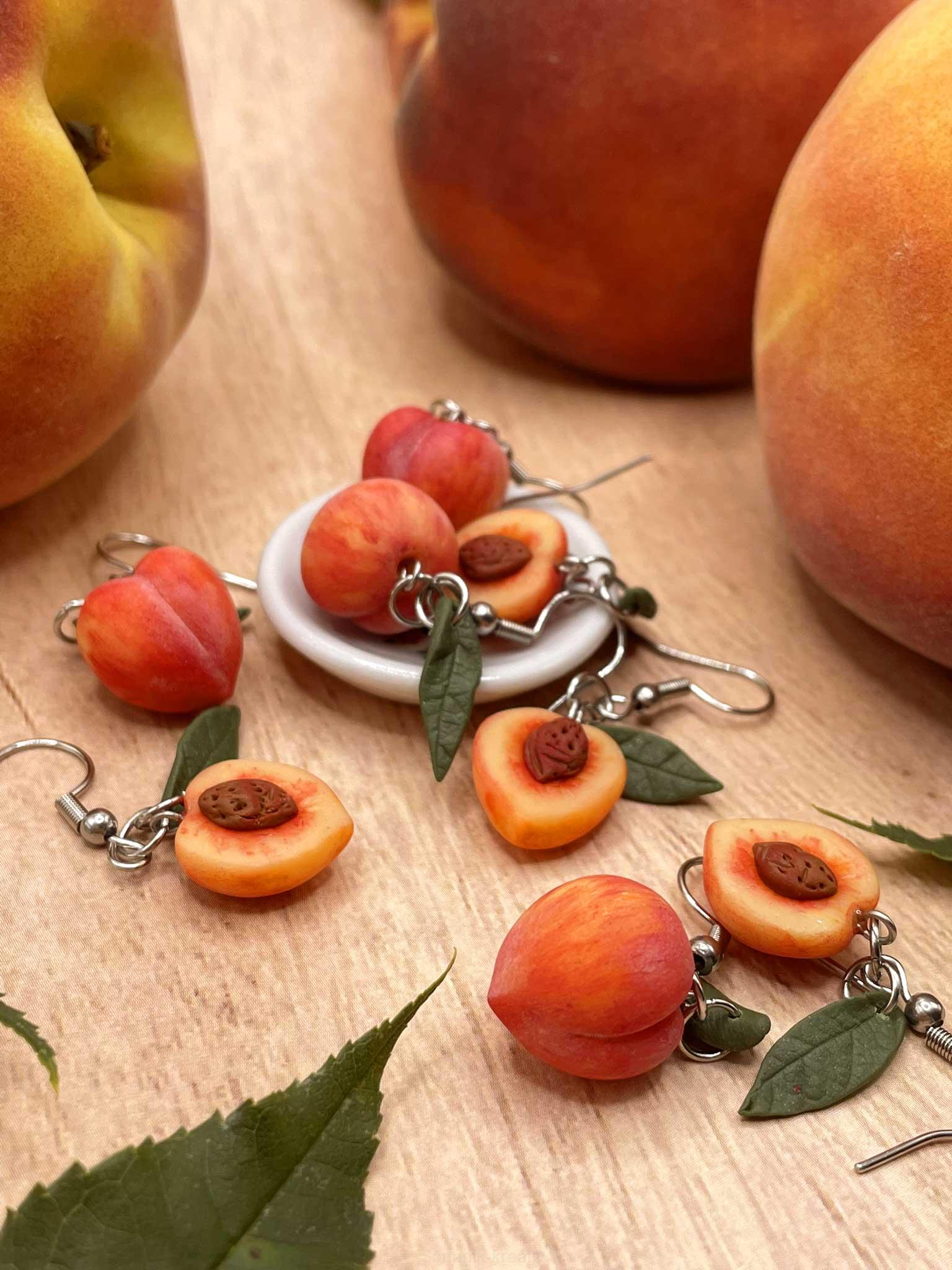 Ručně vymodelované náušnice ve tvaru broskví – jedna celá, druhá rozpůlená s realisticky ztvárněnou peckou. Vyrobeno z polymerové hmoty s důrazem na precizní zpracování a věrohodnost každého detailu.