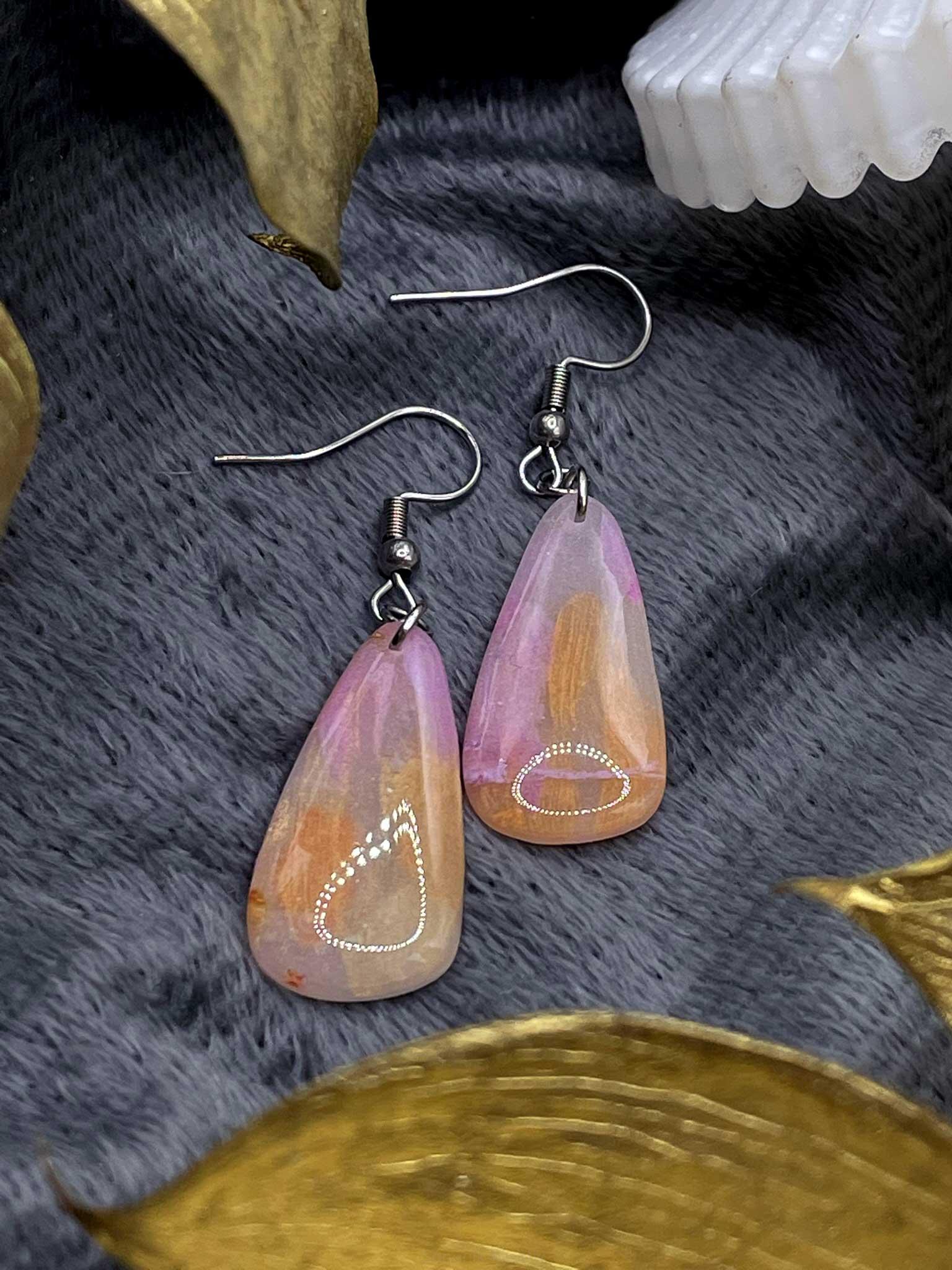 Jemné jako ranní světlo, které se na chvíli zdrží na okraji závěsu. Tyto náušnice vznikly z poloprůsvitného polymeru v odstínech světle růžové a broskvové, zalité do lesklé pryskyřice, která jejich pastelové tóny nechává jemně rozkvétat. Působí étericky, skoro jako malý minerál z říše měkkých barev a tichých okamžiků.
