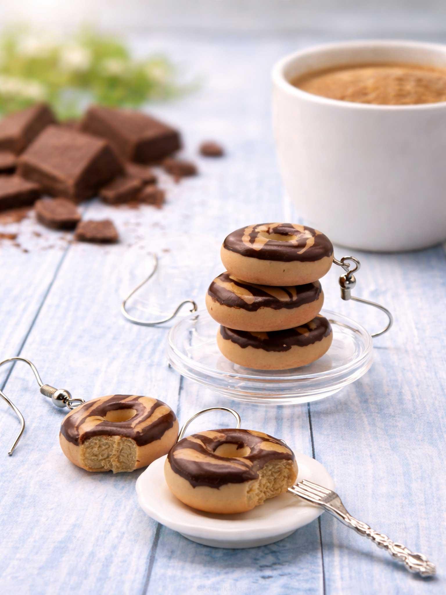Každý donut je ručně vymodelovaný z polymerové hmoty a doplněný o detaily polevy, které dodávají šperkům hloubku i realistický vzhled.