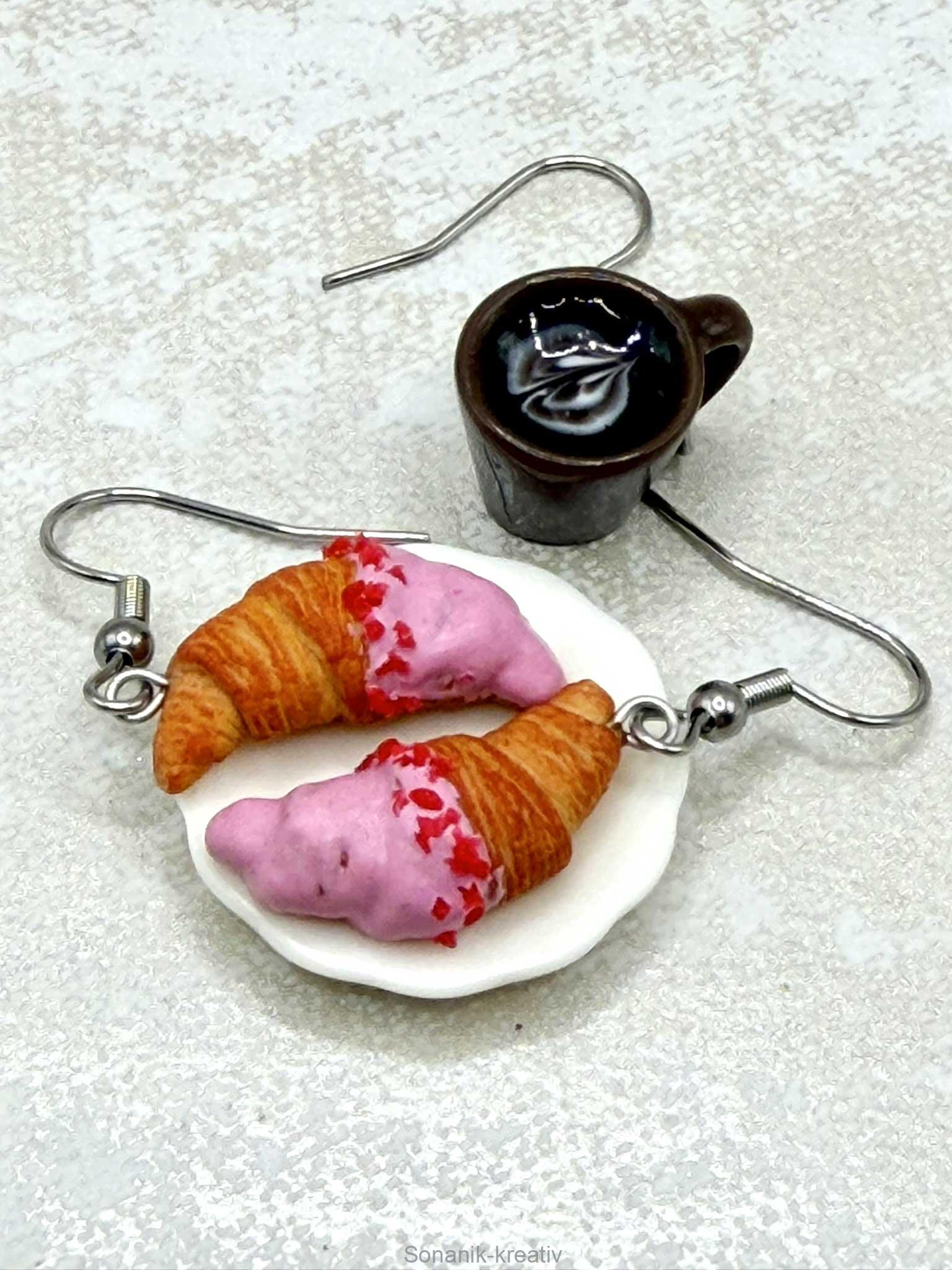 Tento jedinečný pár náušnic propojuje hravost s elegancí. Na jednom uchu najdete ručně modelovaný croissant s malinovou polevou, doplněný o drobné kousky malin, které mu dodávají šťavnatý a realistický vzhled. Druhé ucho zdobí hrníček kávy s jemně vykresleným srdcem na hladině, jako by byl právě připravený baristou. Společně tvoří neotřelý doplněk, který působí něžně, ale zároveň nezůstane bez povšimnutí.