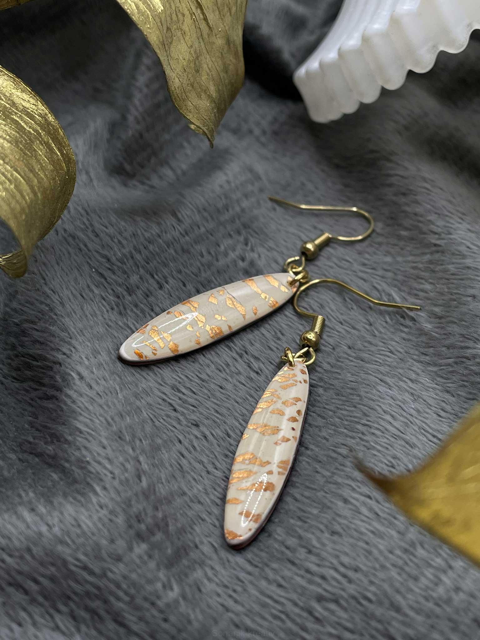 Jemné, ale rozhodně nepřehlédnutelné. Tyto visací náušnice vznikly z polymerové hmoty, do které jsem zasadila drobné kousky zlatých plátků, a celý povrch zalila křišťálově pryskyřicí. Výsledek? Hladký lesk, který chytá světlo jako kapka rosy.