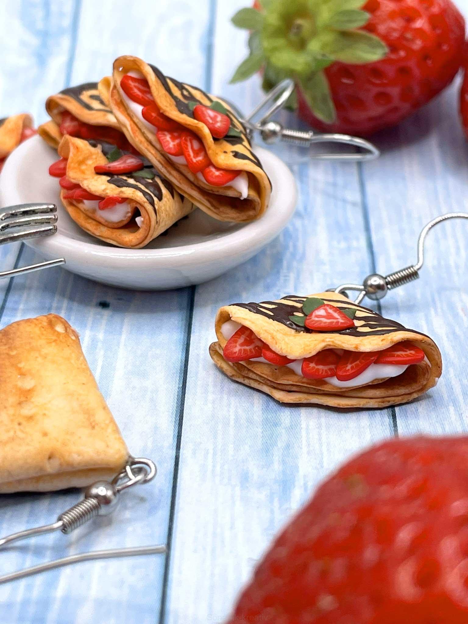 Jestli milujete palačinky jako já, tyto náušnice si zamilujete na první pohled. Každý kousek je pečlivě vymodelován z polymerové hmoty tak, aby připomínal opravdovou dobrotu – nadýchanou palačinku plněnou šlehačkou, ozdobenou šťavnatými jahůdkami a přelitý čokoládovým toppingem.
