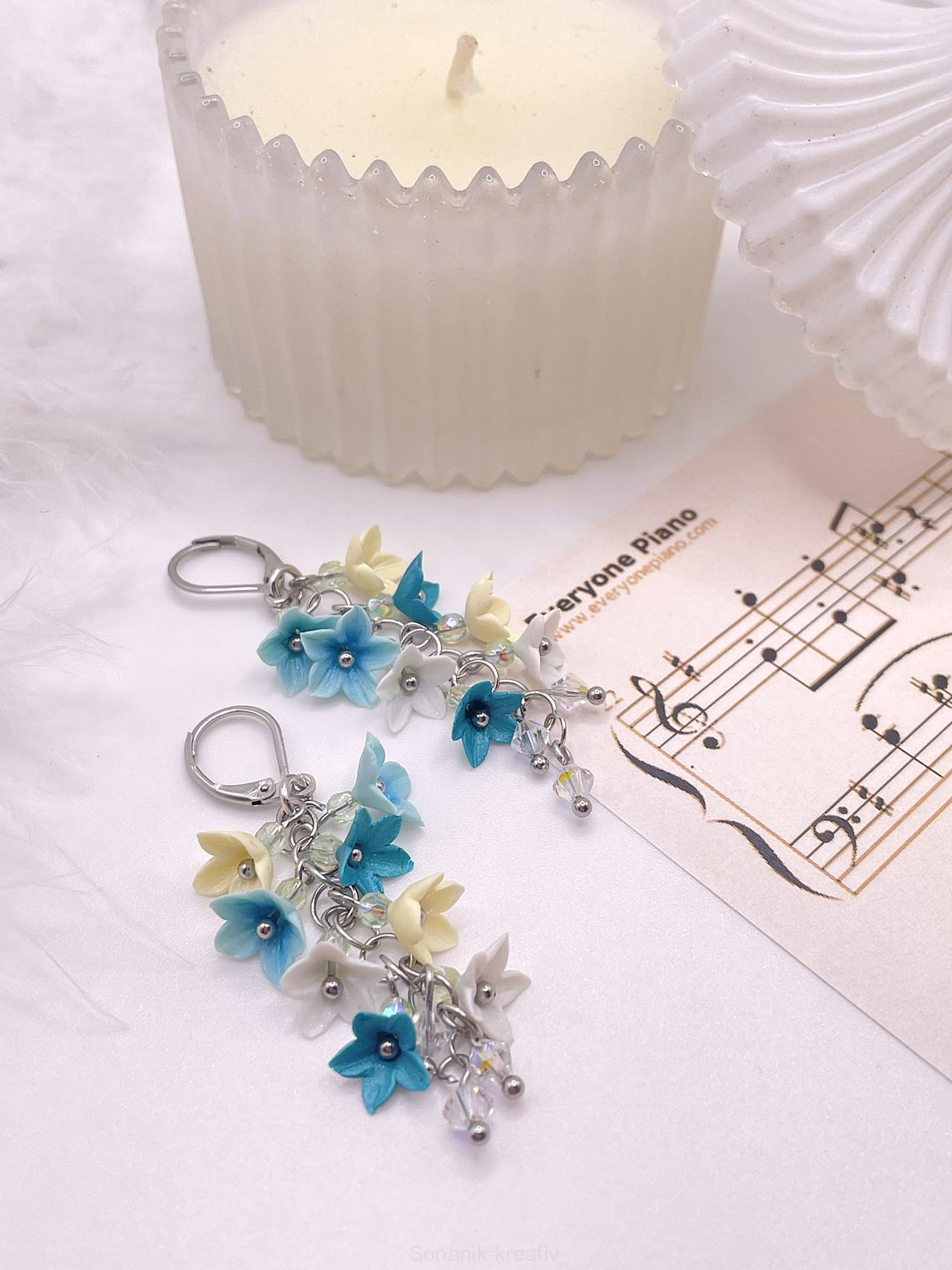 Náušnice květinkové, každý kvítek je pečlivě vymodelován z polymerové hmoty v odstínech vanilkové, tyrkysové a bílé. Náušnice jsou doplněny skleněnými korálky a korálky Swarovski.