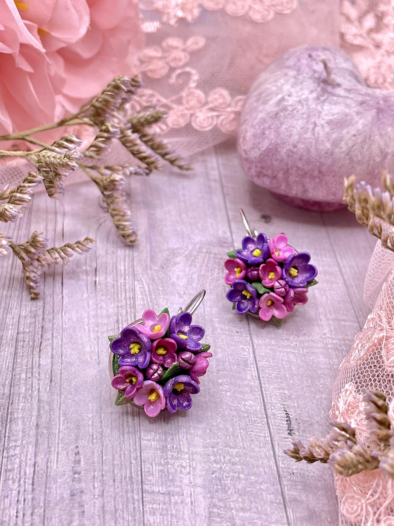 Náušnice květinkové, každý kvítek je pečlivě vymodelován z odstínů fialové polymerové hmoty a dozdobeno metalickým pudrem.