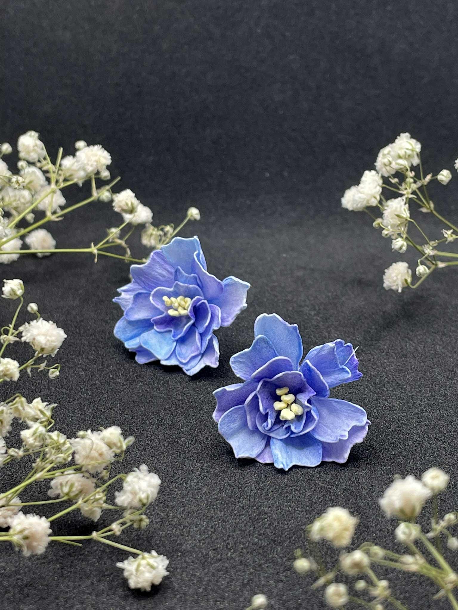 Náušnice puzety/napichovací s ručně vyráběnými něžnými kvítky z Foamiranu v ostínech modré a fialové barvy s pestíky pastelově žluté barvy.