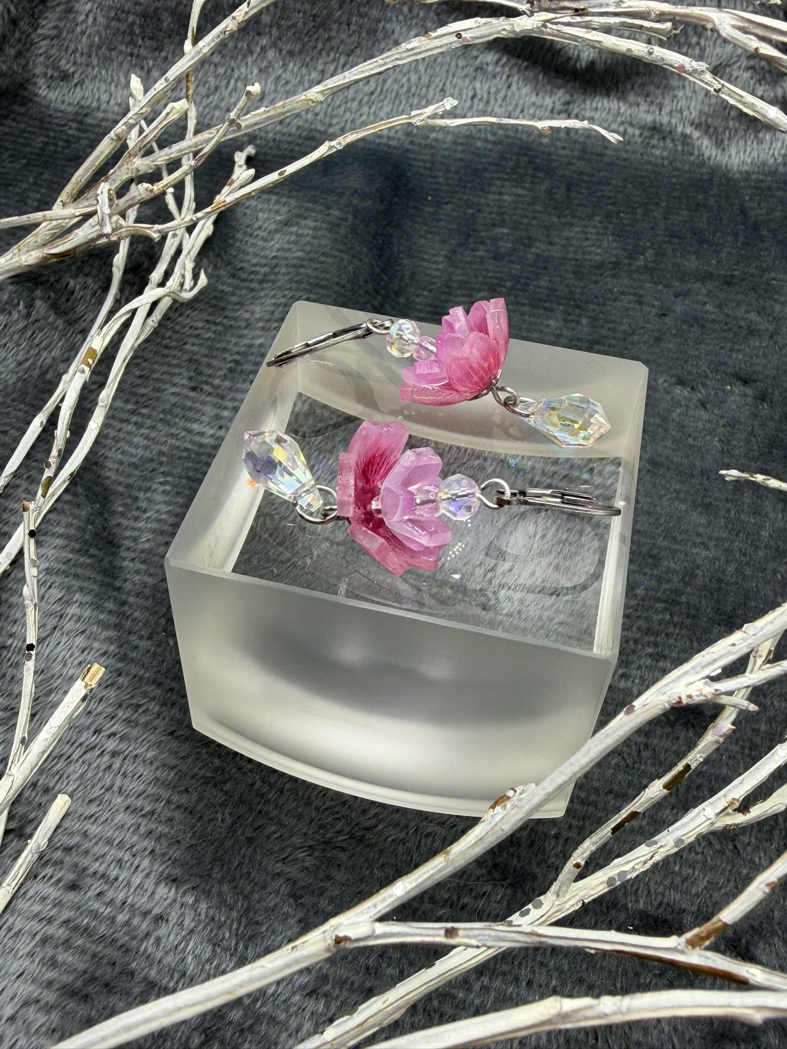 Náušnice jsou vyrobené ze speciální fólie, ručně malované, tvarované a lakované. Květy jsou doplněné o broušené korálky a jemné slzičky, které podtrhují jejich luxusní vzhled a dodávají decentní lesk.