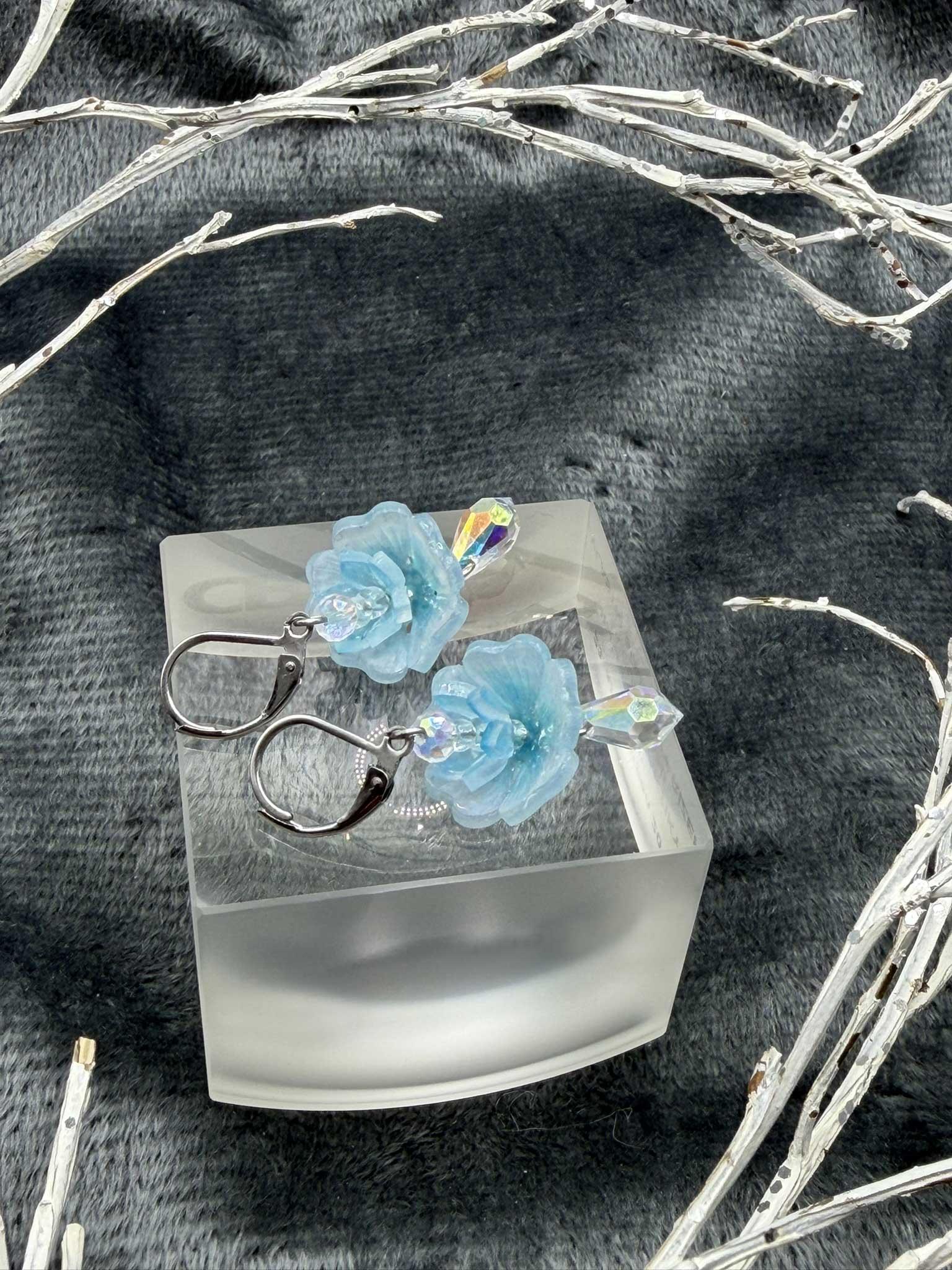 Náušnice jsou vyrobené ze speciální fólie, ručně malované, tvarované a lakované. Květy jsou doplněné o jemné broušené korálky a drobné slzičky, které dodávají šperku lehký třpyt a sofistikovaný detail.
