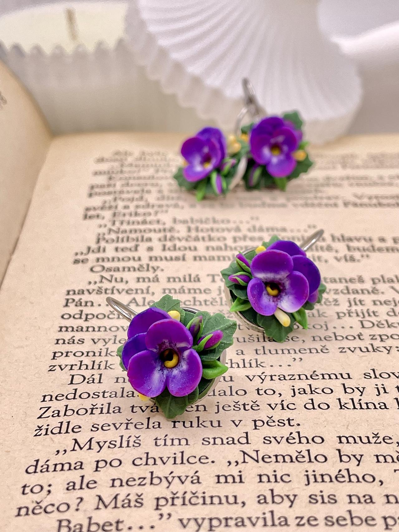 Náušnice květinkové, každý kvítek je pečlivě vymodelován z polymerové hmoty, květy macešek, poupátka i lístky.