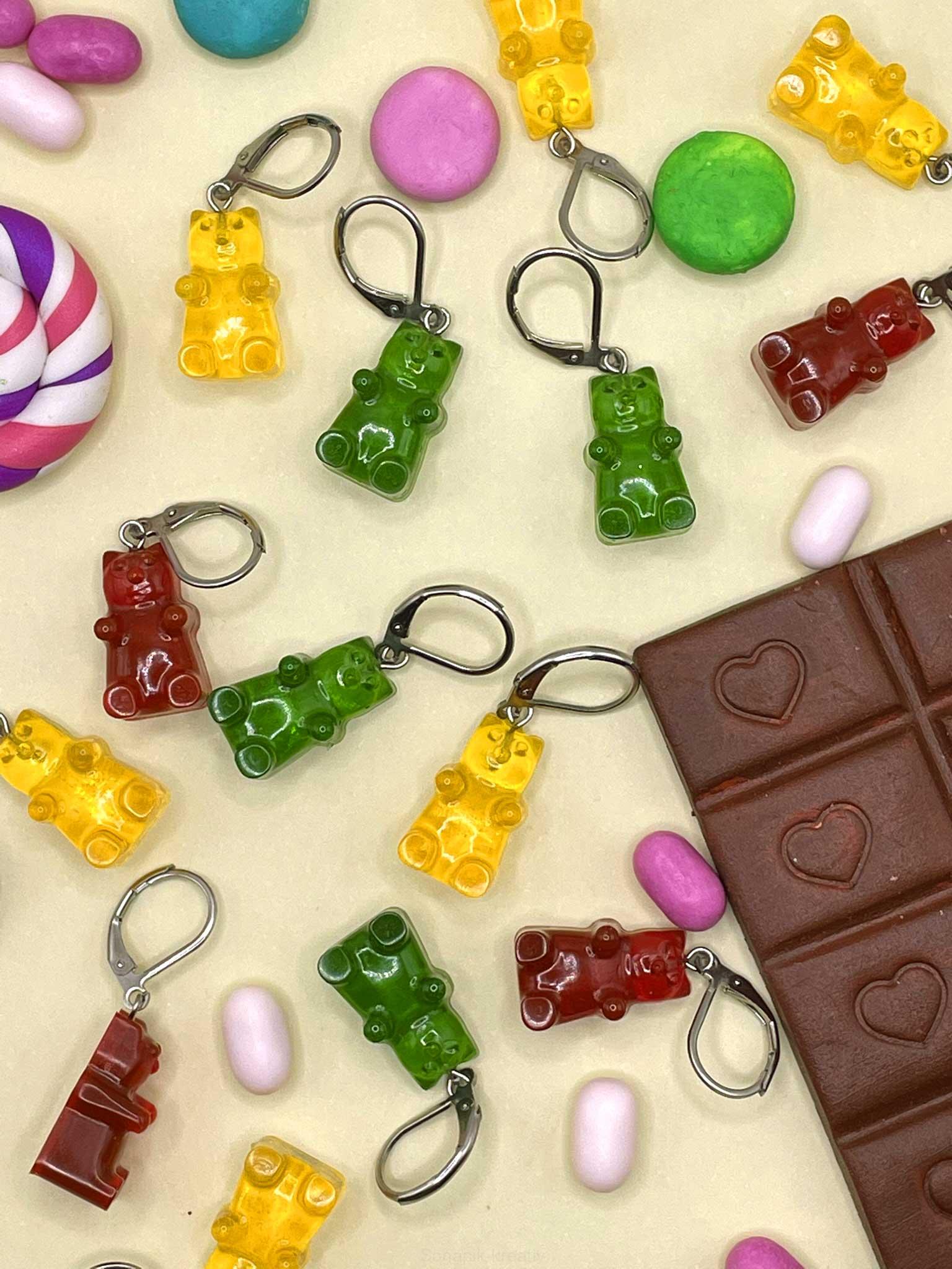 Hledáte náušnice, které zaujmou a pobaví a dodají vašemu outfitu neotřelý šmrnc? Náušnice z křišťálové pryskyřice odlité do tvaru "gumového medvídka".