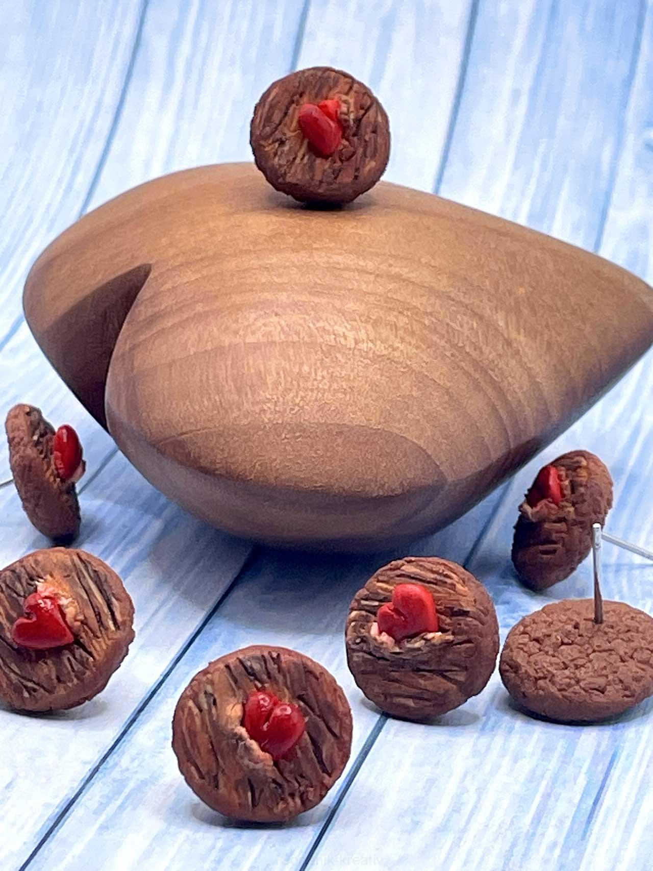 Náušnice pecky ručně a s láskou vymodelované z polymeru. Imitace dřeva, srdíčko má krásně sytou barvu.