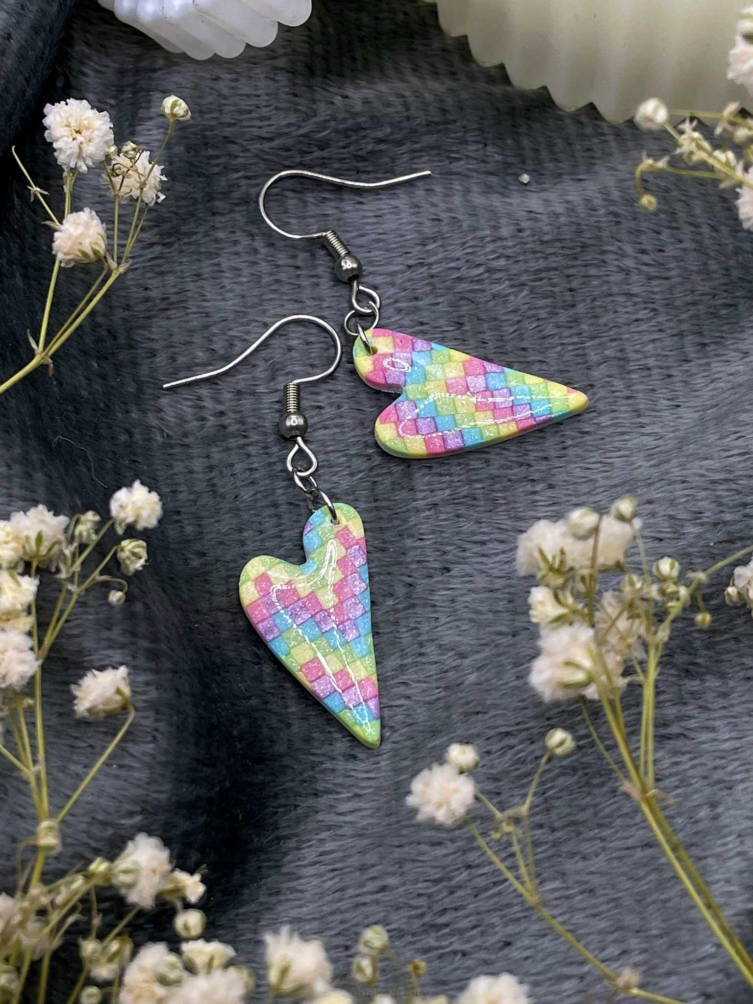 Nepravidelná srdce vytvořená technikou bargello v jemných pastelových odstínech duhy působí hravě, lehce a zároveň elegantně. Metalický polymer dodává barvám hloubku a jemný lesk, který je zvýrazněn zalitím křišťálovou pryskyřicí. Každý pár je originál, ve kterém se barvy prolínají trochu jinak.