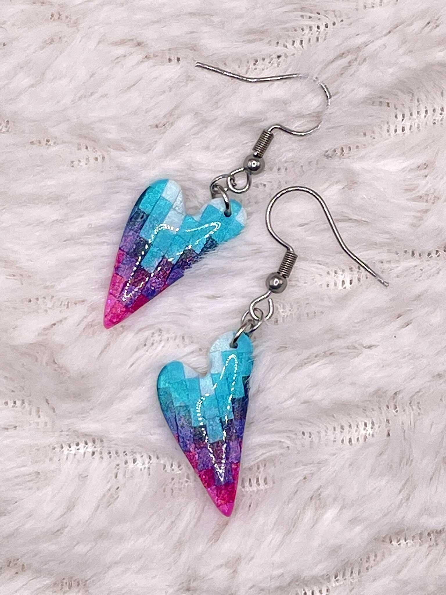 Barevná kombinace modré, fialové a růžové vytváří elegantní, lehce snový dojem. Technika bargello dává srdíčkům dynamiku a metalický polymer krásně pracuje se světlem. Zalévání pryskyřicí podtrhuje hloubku barev a dodává náušnicím hladký, lesklý povrch.