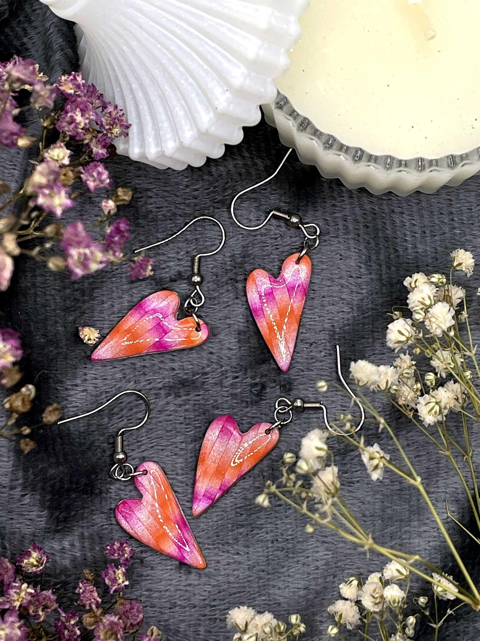 Výrazná kombinace růžové, oranžové a magenty působí energicky a radostně. Technika bargello vytváří jemné barevné přechody a metalický polymer dodává srdíčkům živý lesk. Pryskyřice celý motiv uzavírá do hladkého, lesklého tvaru a zvýrazňuje jednotlivé barvy.