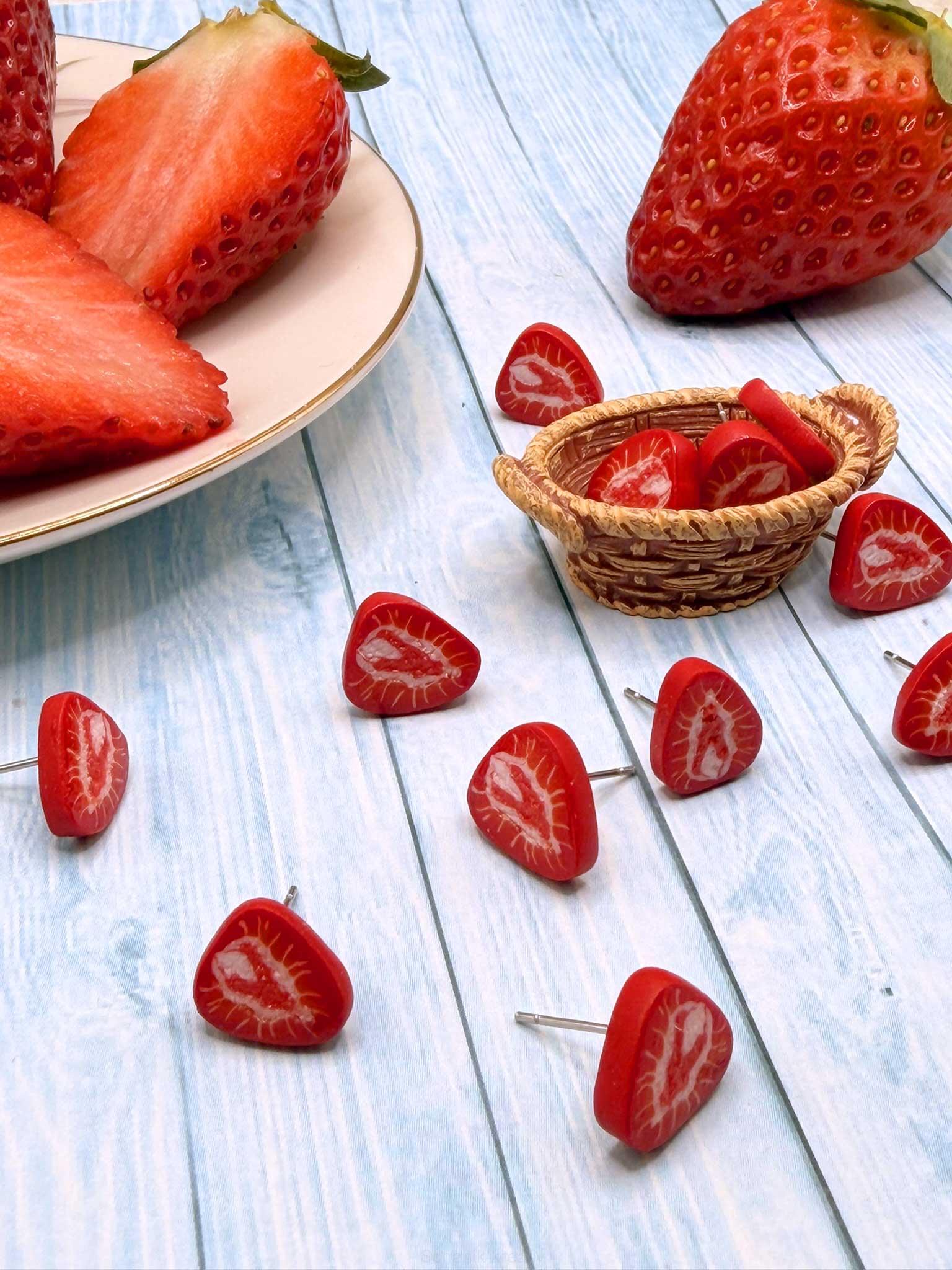 Šťavnatý detail zachycený v jediném okamžiku. Napichovací náušnice ve tvaru plátku jahody zaujmou svou realistickou kresbou i jemnými přechody barev, které věrně napodobují skutečný řez ovocem.
