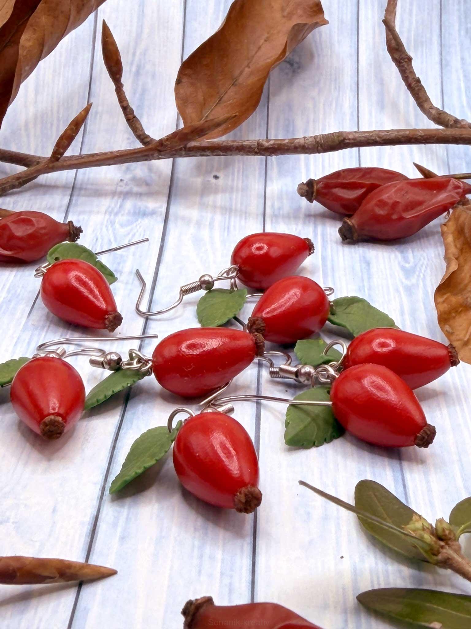 Drobné náušnice inspirované přírodou – realisticky vymodelované plody šípku s jemným zeleným lístečkem. Každý šípek je ručně vytvořen z polymerové hmoty a domalován, takže žádný kousek není úplně stejný – stejně jako v přírodě.