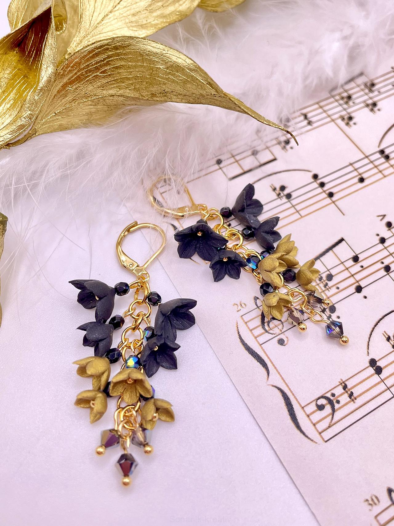 Náušnice květinkové, každý kvítek je pečlivě vymodelován z polymerové hmoty v černé a zlaté barvě. Náušnice jsou doplněny skleněnými korálky a korálky Swarovski.