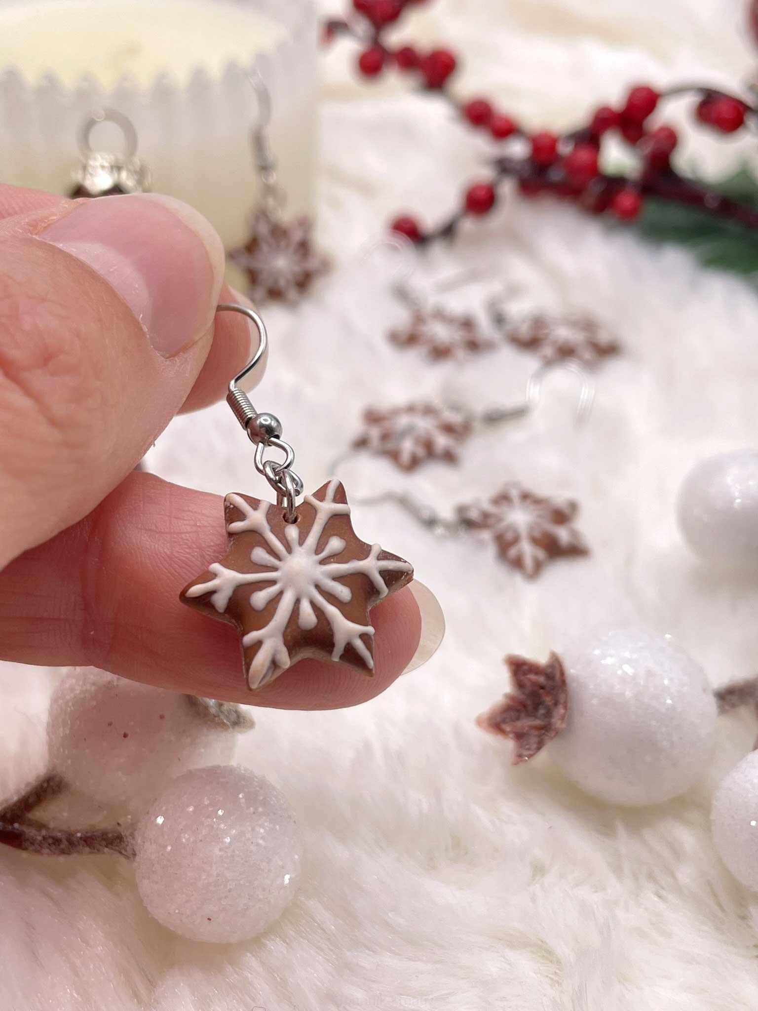 Jemné, visací náušnice inspirované kouzlem zimy a vůní perníků. Každá vločka je vyrobena z polymeru a ručně dozdobená tak, aby působila jako opravdová – sladká, ale bez cukru.