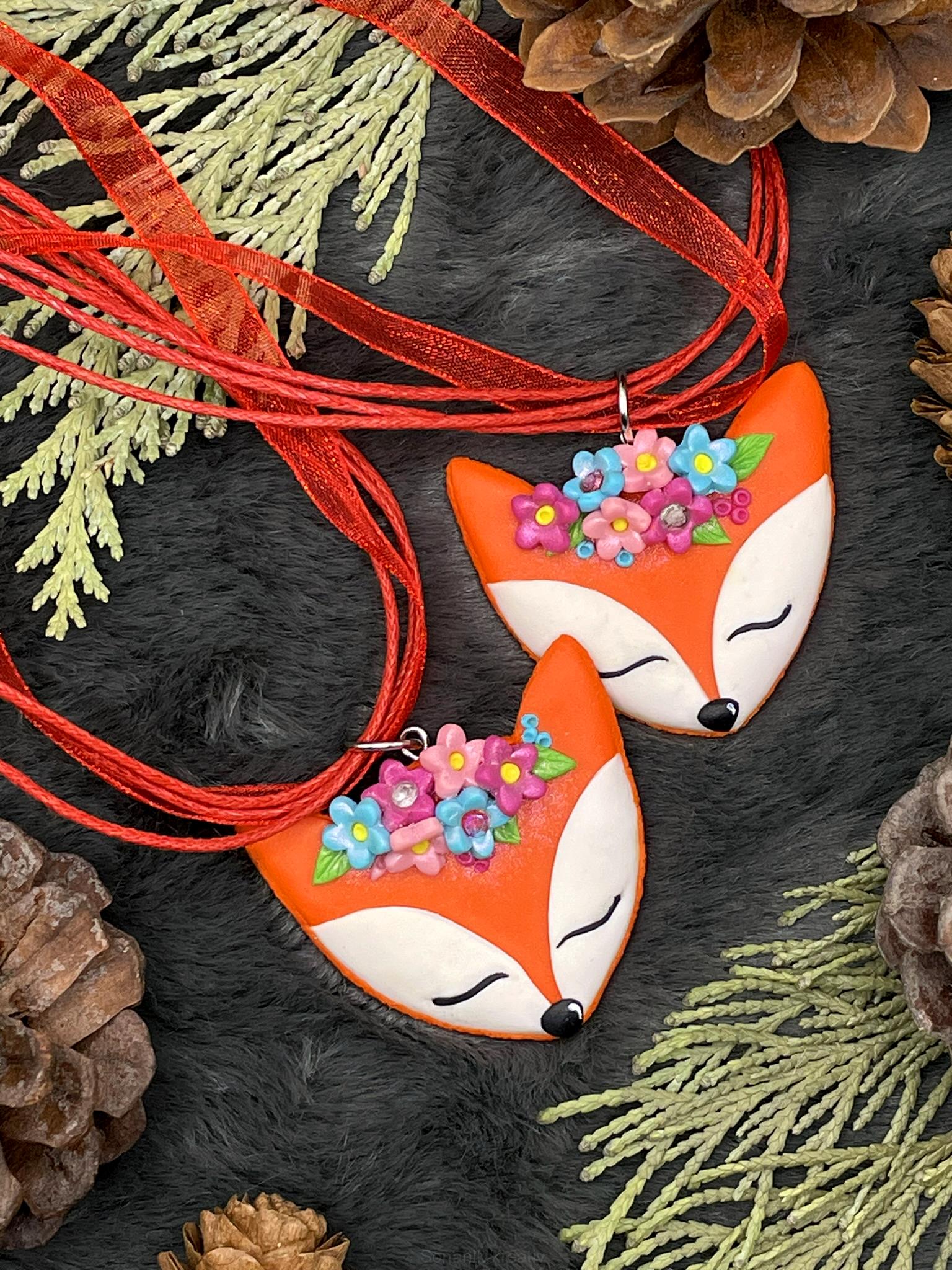 Přívěsek pro milovníky těchto zvířátek, ručně vymodelovaná roztomilá lištička z polymerové hmoty. Kvítky doplněny kamínky. Zavěšeno na červené voskované a organzové šňůrce. Komponenty z bižuterního kovu.