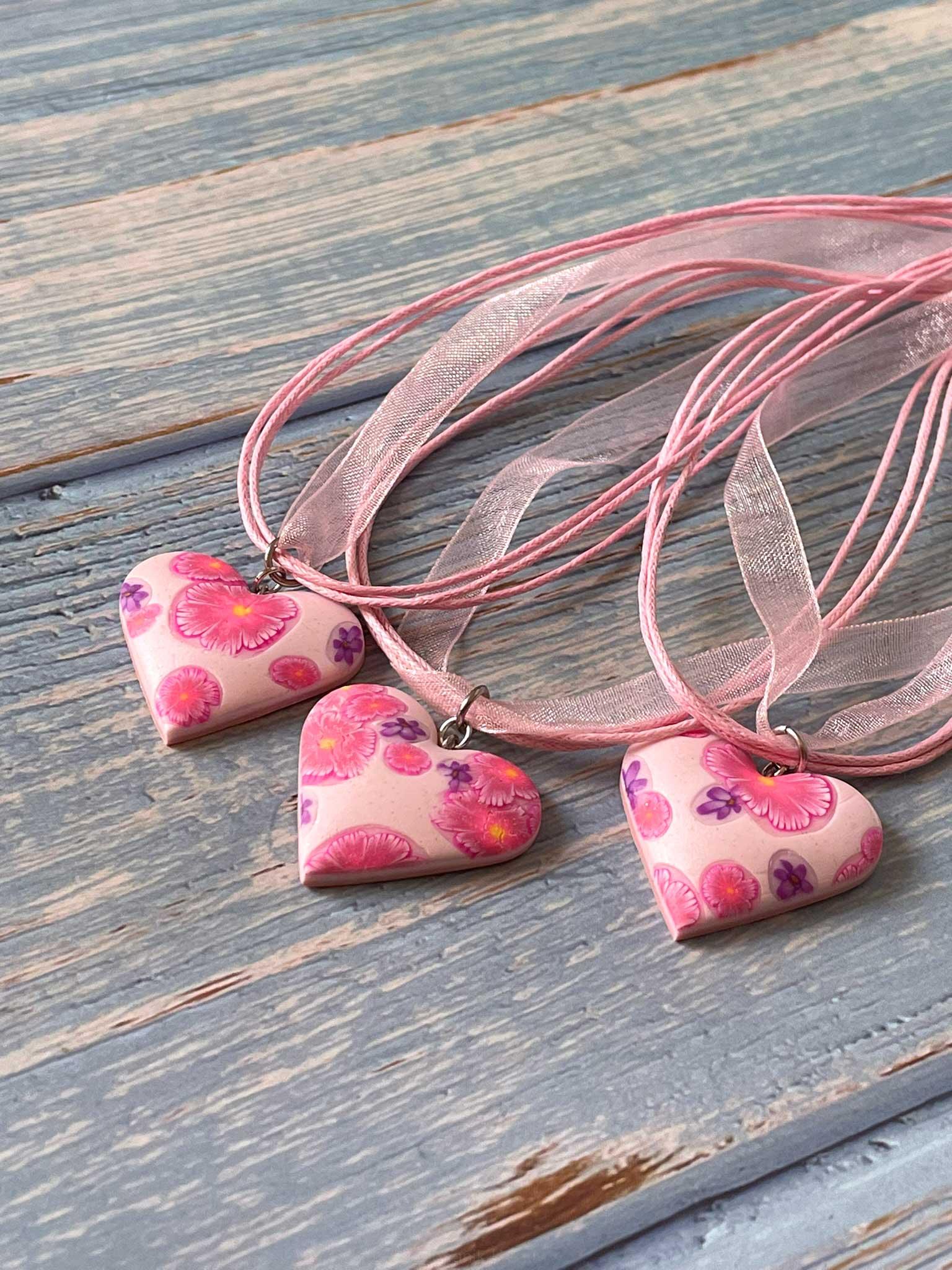 Dutý květinový přívěsek ve tvaru pravidelného srdíčka, vymodelovaný z polymerové hmoty.