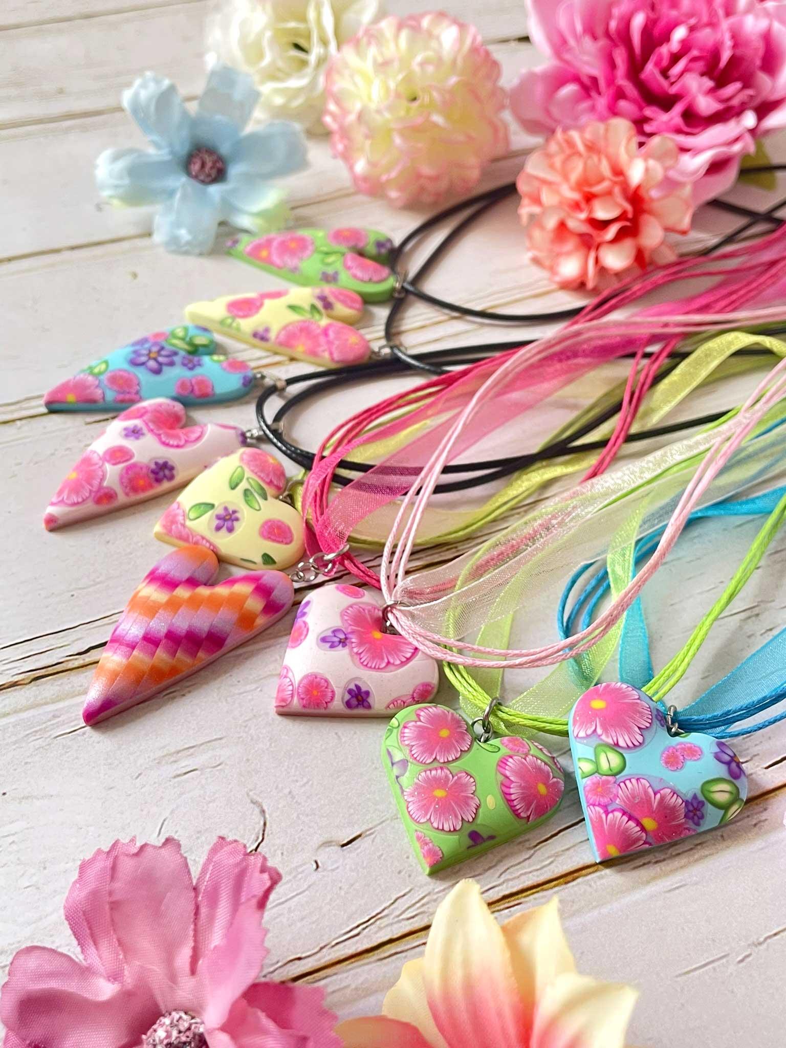 Dutý květinový přívěsek ve tvaru nepravidelného srdce vymodelovaný z polymerové hmoty.