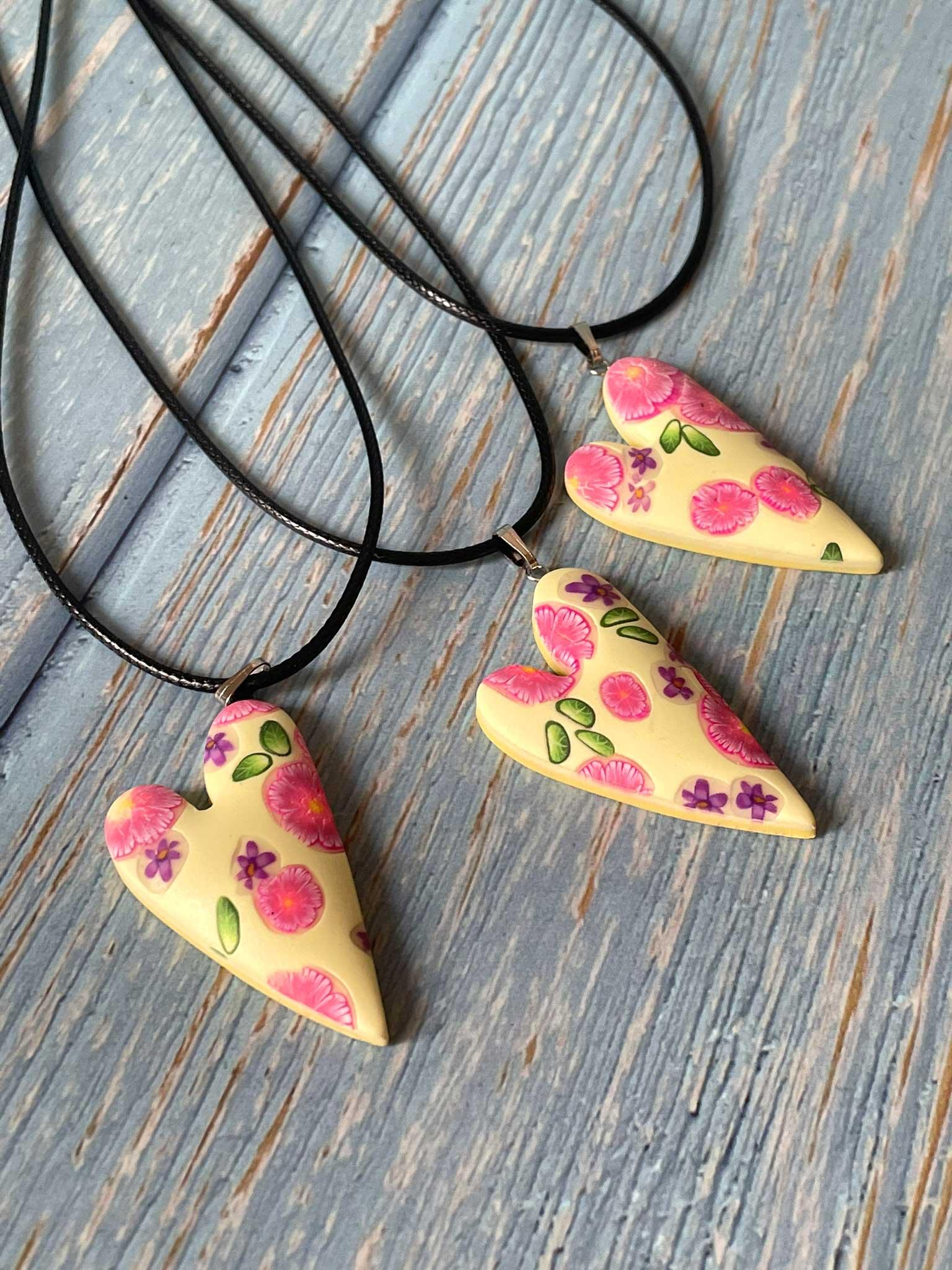 Dutý květinový přívěsek ve tvaru nepravidelného srdce vymodelovaný z polymerové hmoty.