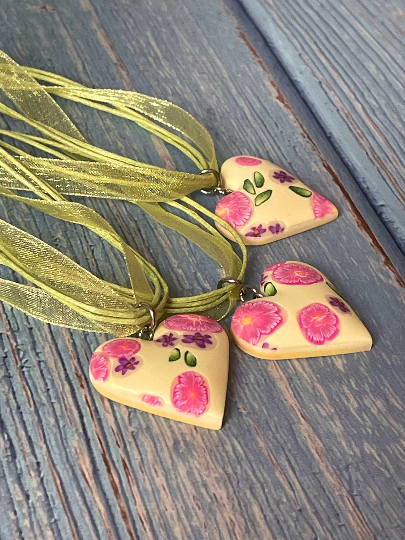 Dutý květinový přívěsek ve tvaru pravidelného srdíčka, vymodelovaný z polymerové hmoty.