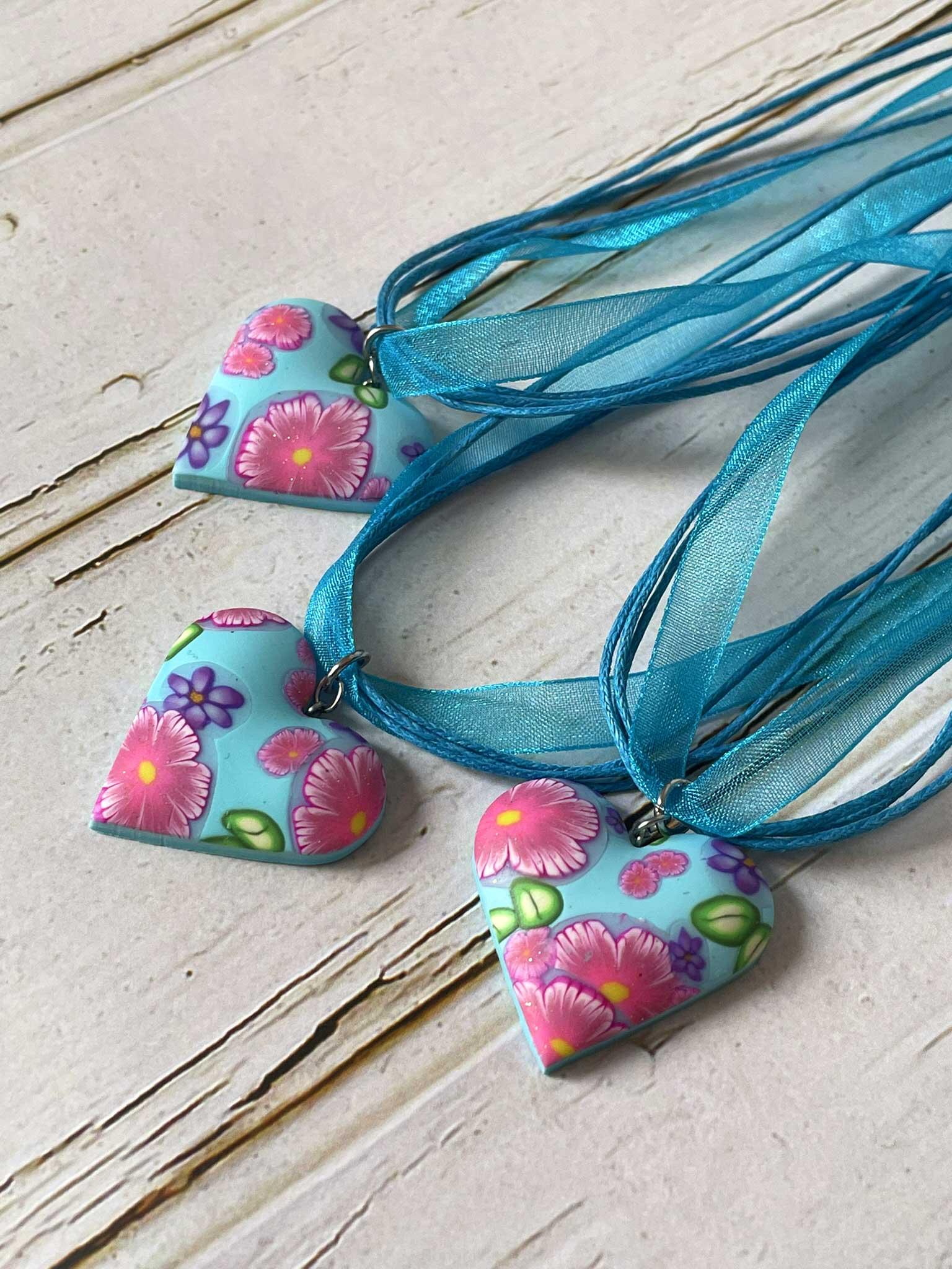 Dutý květinový přívěsek ve tvaru pravidelného srdíčka, vymodelovaný z polymerové hmoty.