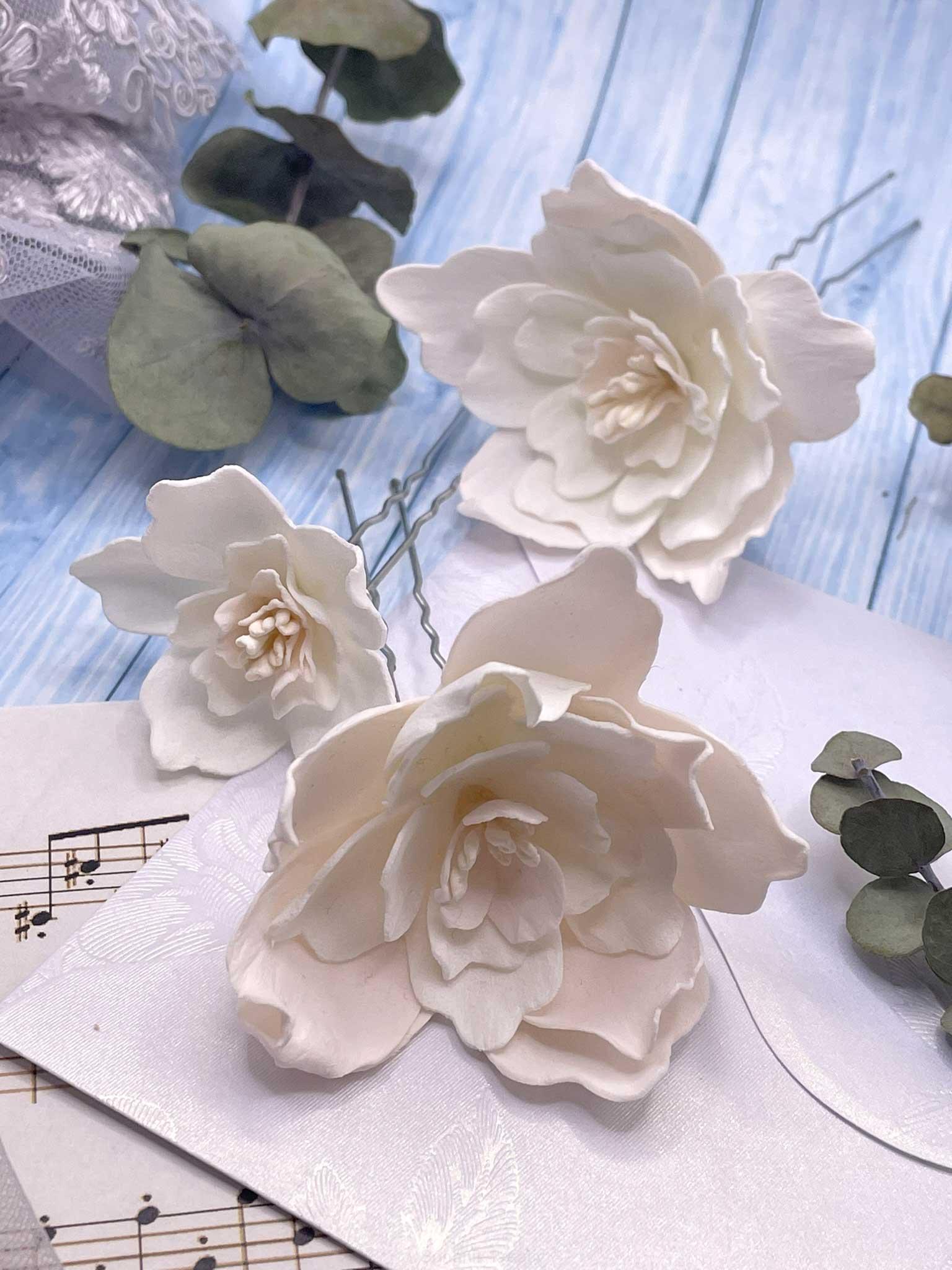 Tři vlásenky zdobené ručně vyráběnými kvítky z foamiranu v jemných odstínech bílé a krémové působí něžně a velmi elegantně. Díky své lehkosti a přirozenému vzhledu jsou ideálním doplňkem pro slavnostní příležitosti, svatby i romantické chvíle.