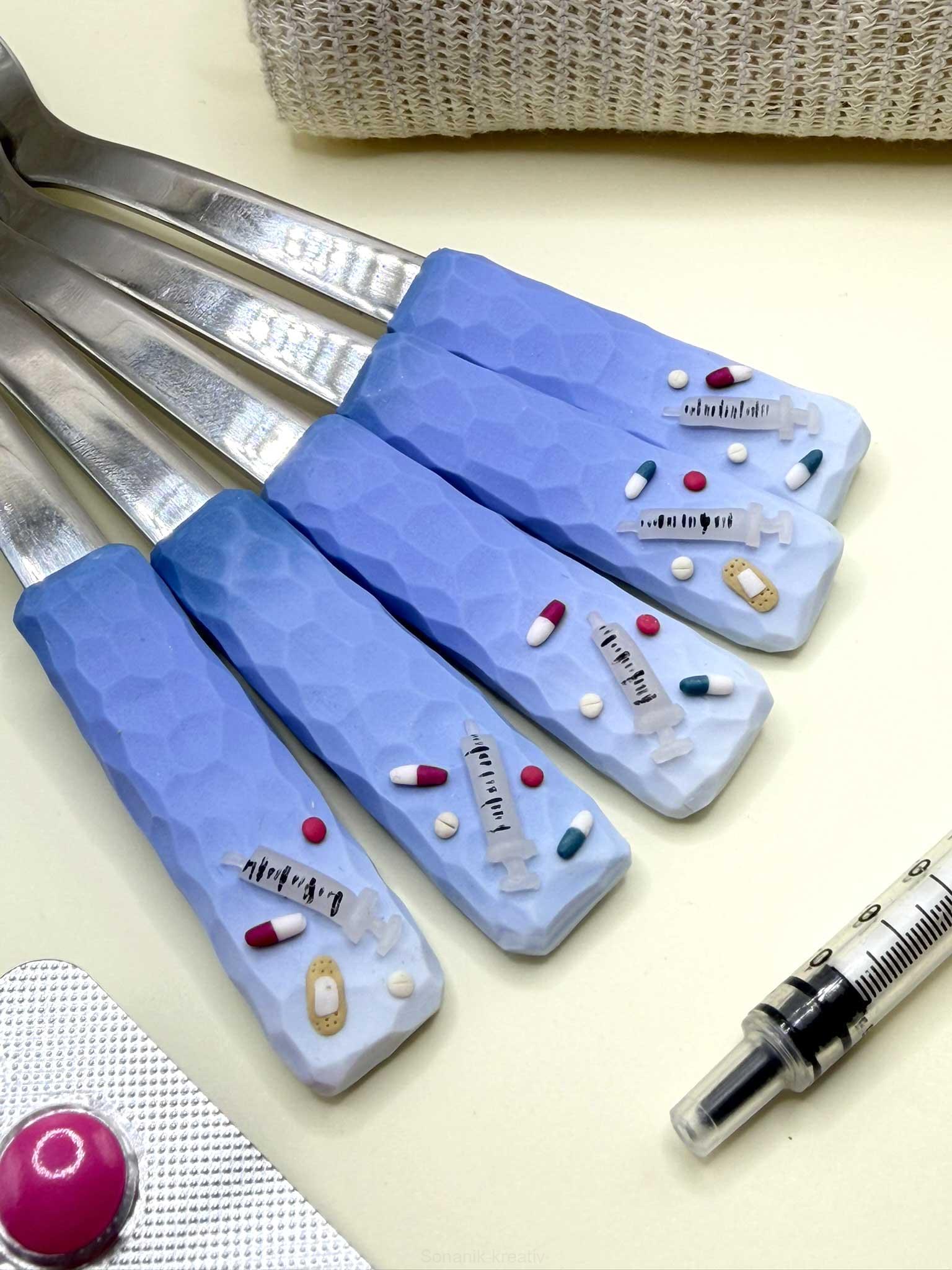 Čajová lžička z nerezové oceli zdobená polymerem v jemných odstínech a doplněná ručně modelovanými miniaturami tablet a injekční stříkačky. Malý dárek, který potěší každou sestřičku, lékaře i kohokoli z malého zdravotnického světa — ať už jako symbol profese, nebo milá pozornost.