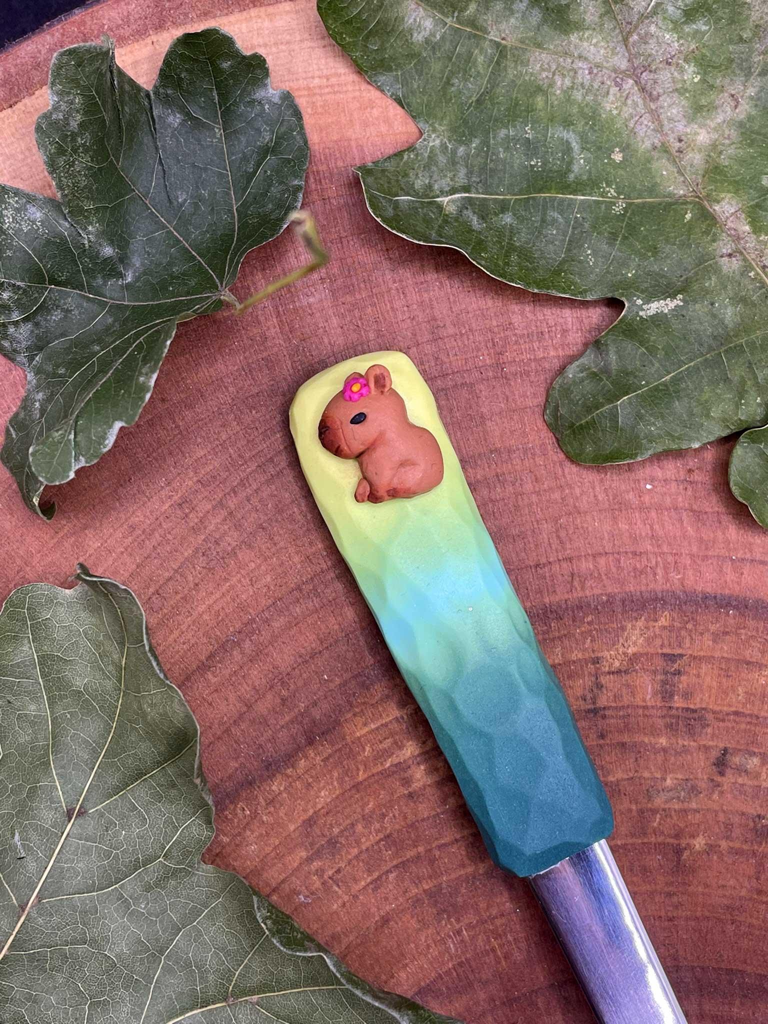 Originální čajová lžička zdobená polymerem v odstínech zelené, modré a žluté, na jejímž konci se pohodlně uvelebila roztomilá kapybara – symbol klidu a pohody.