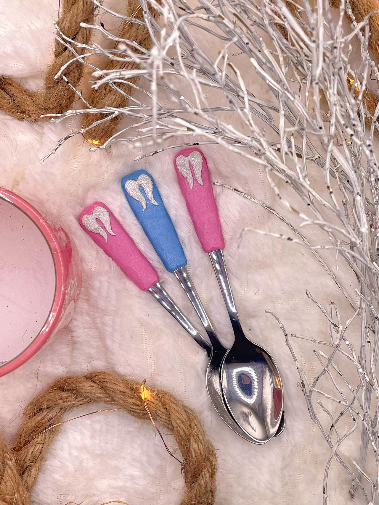Lžička zdobená polymerem, dvě metalické barvy s vymodelovanými andělskými křídly a bílým metalickým pudrem.