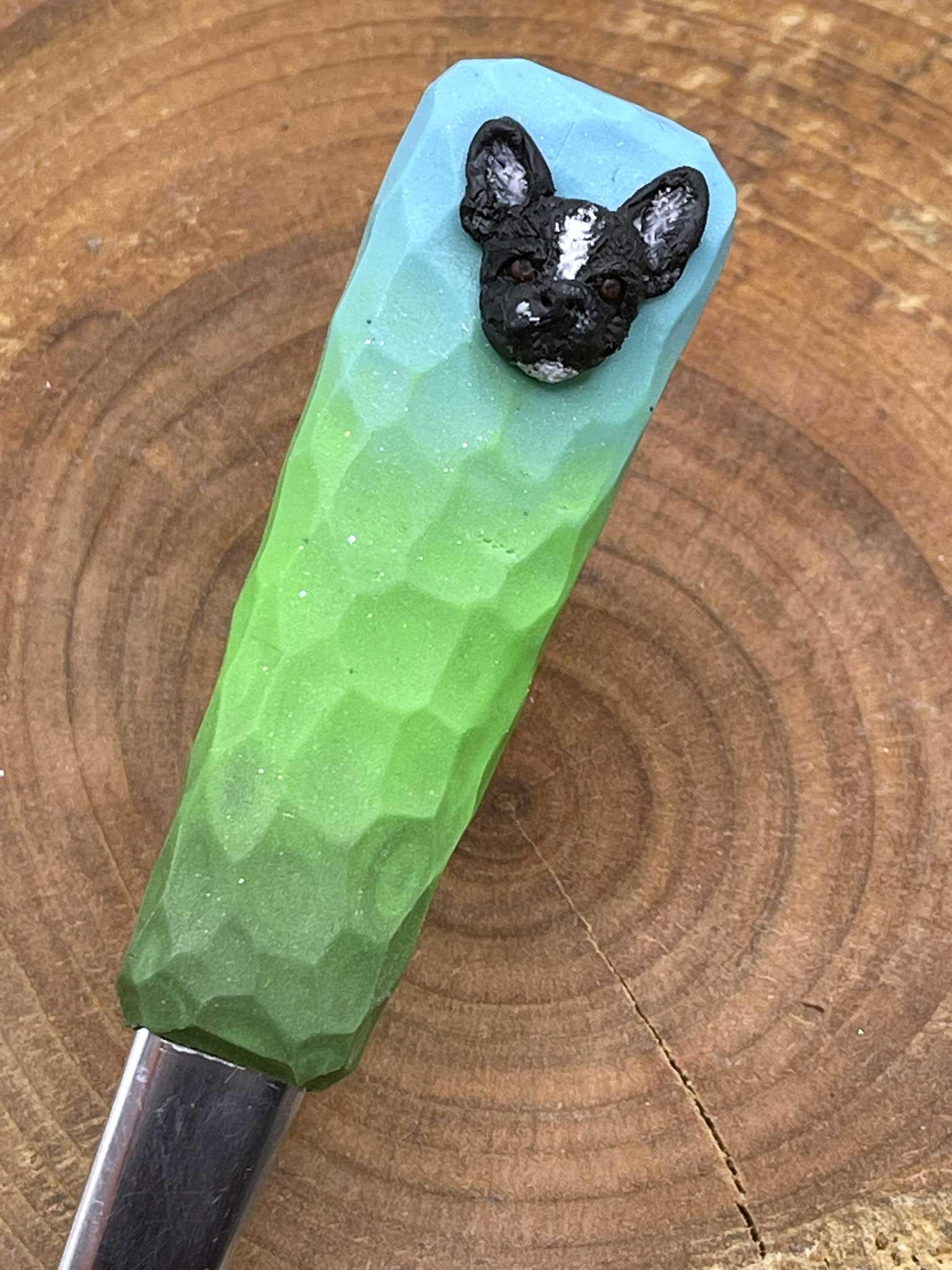 Tato nerezová lžička zdobená polymerovou hmotou s hlavičkou pejska je víc než jen obyčejný kousek nádobí – je to malé umělecké dílo, které vám zpříjemní každé ráno.