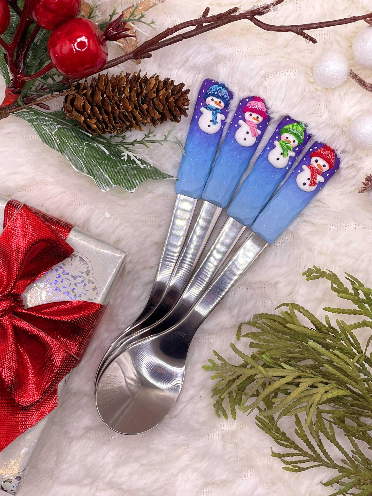 Čajová lžička zdobená polymerem v odstínech bílé, modré a tmavě modré, doplněná ručně vymodelovaným sněhuláčkem se šálou a čepičkou. Každý detail je pečlivě propracovaný, aby zimní hrnek čaje nebo kávy získal tu správnou hřejivou atmosféru.