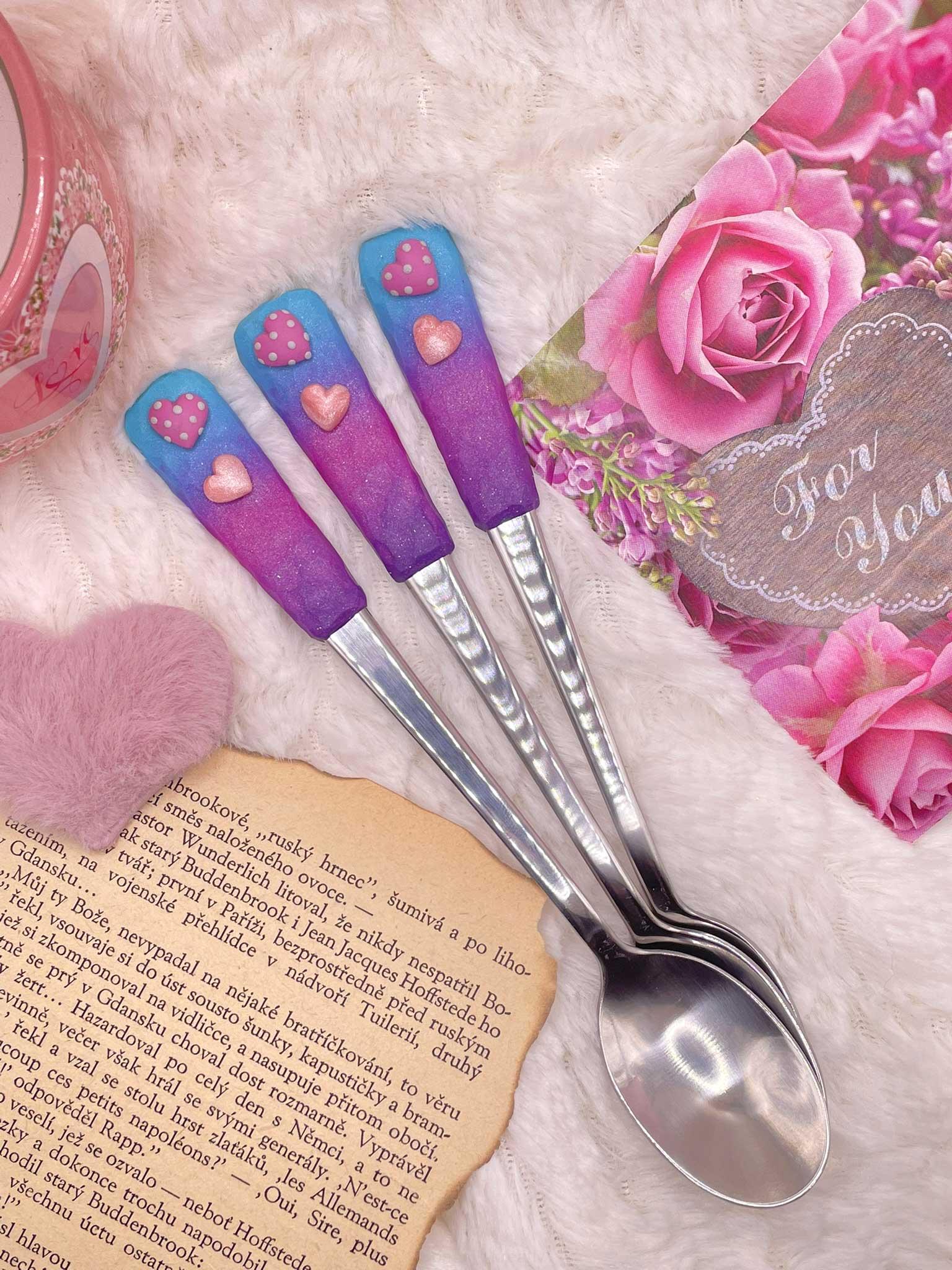 Originální čajová lžička, která potěší všechny romantické duše. Zdobená polymerem v odstínech fialové a tyrkysové a doplněná drobnými ručně modelovanými srdíčky, která symbolizují radost z maličkostí.