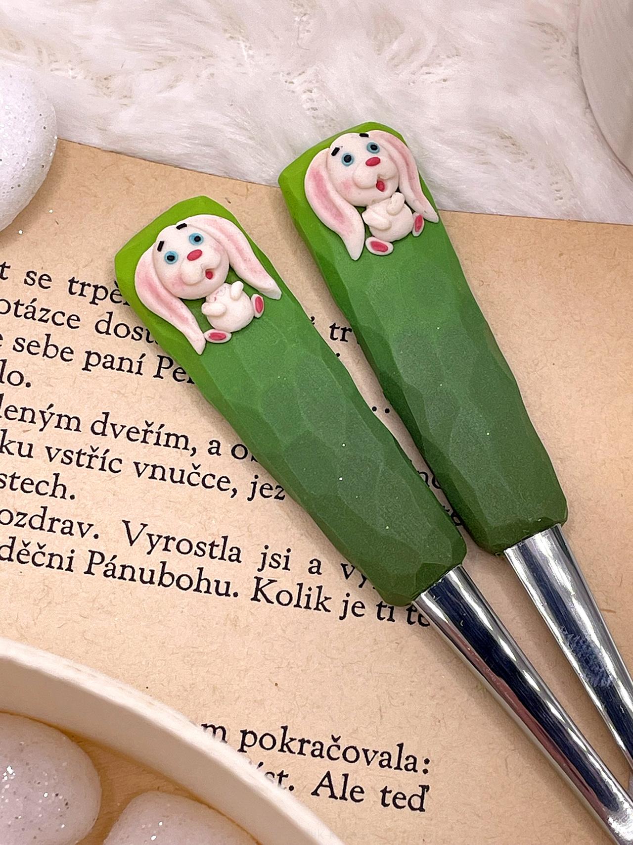 Čajová lžička zdobená polymerem v odstínech zelené s ručně vymodelovaným zajíčkem.