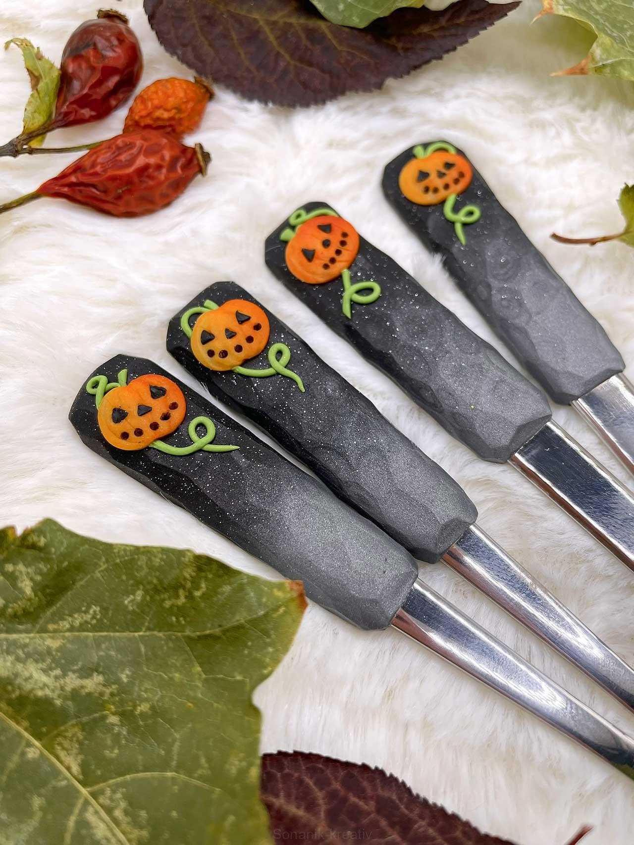 Čajová lžička zdobená polymerem v odstínech šedé se třpyttkami, s ručně vymodelovanou strašidelnou dýní. Když motiv na lžičce po nějaký čas vystavíte světlu, tak potom ve tmě mírně světélkuje :)