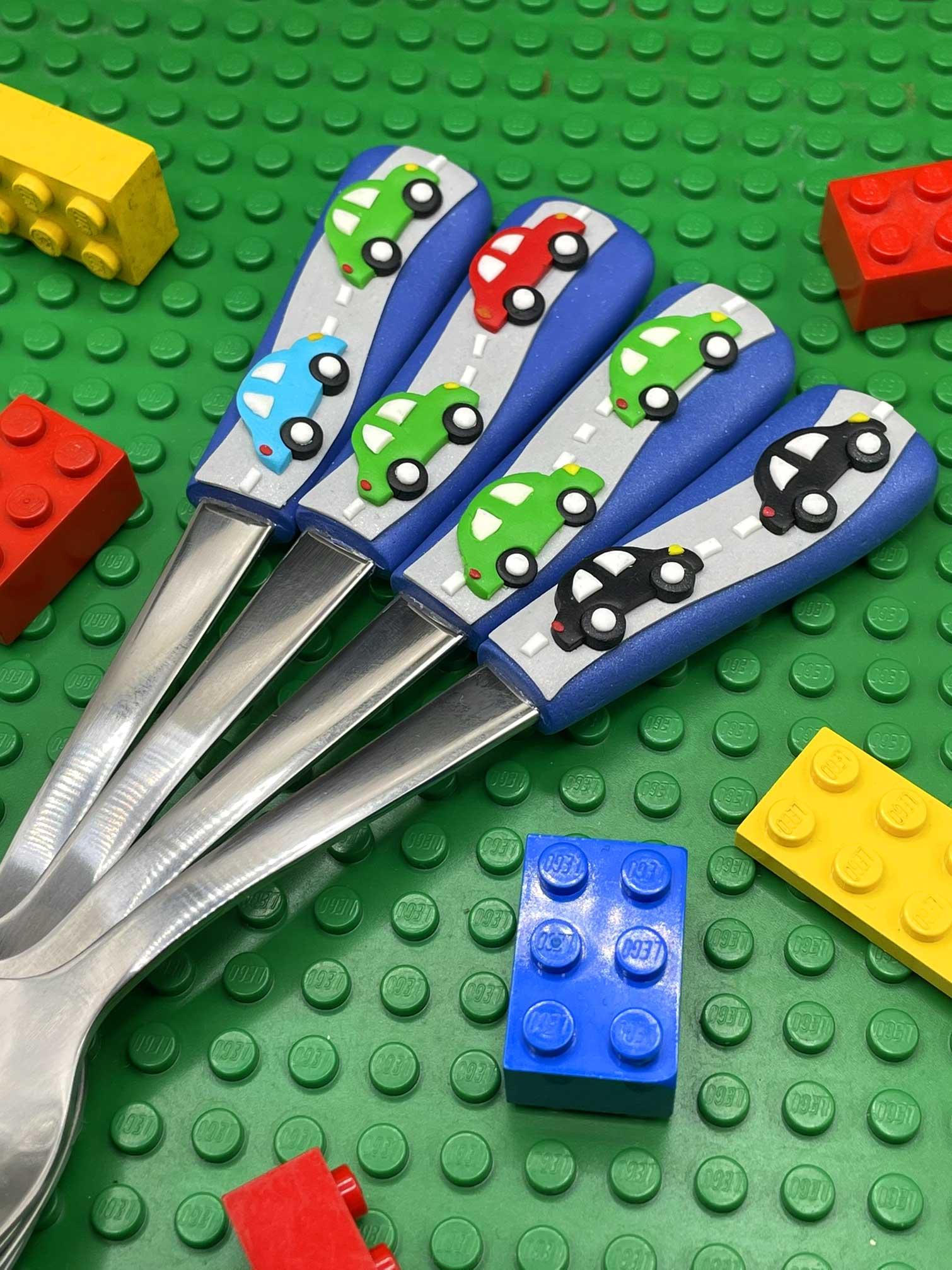Polévková lžíce dětská, zdobená polymerem, s ručně vymodelovanými autíčky.