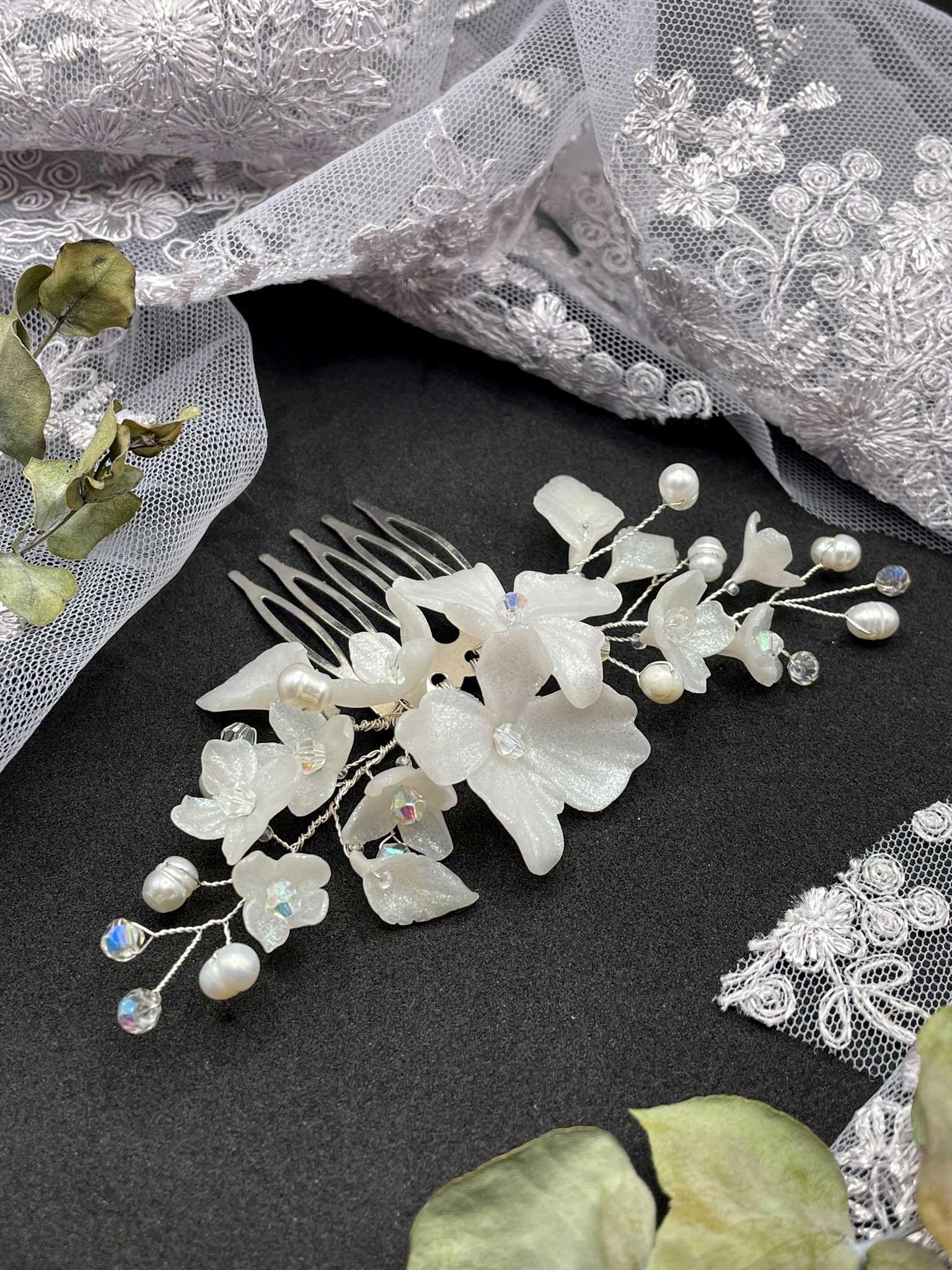 Kovový hřebínek do vlasů vyrobený technikou drátování s ručně modelovanými kvítky a lístky z poloprůsvitné perleťové polymerové hmoty bílé barvy. Doplněno o perličky, broušené korálky a drobný rokajl. Drátek i hřebínek jsou z bižuterního kovu stříbrné barvy.