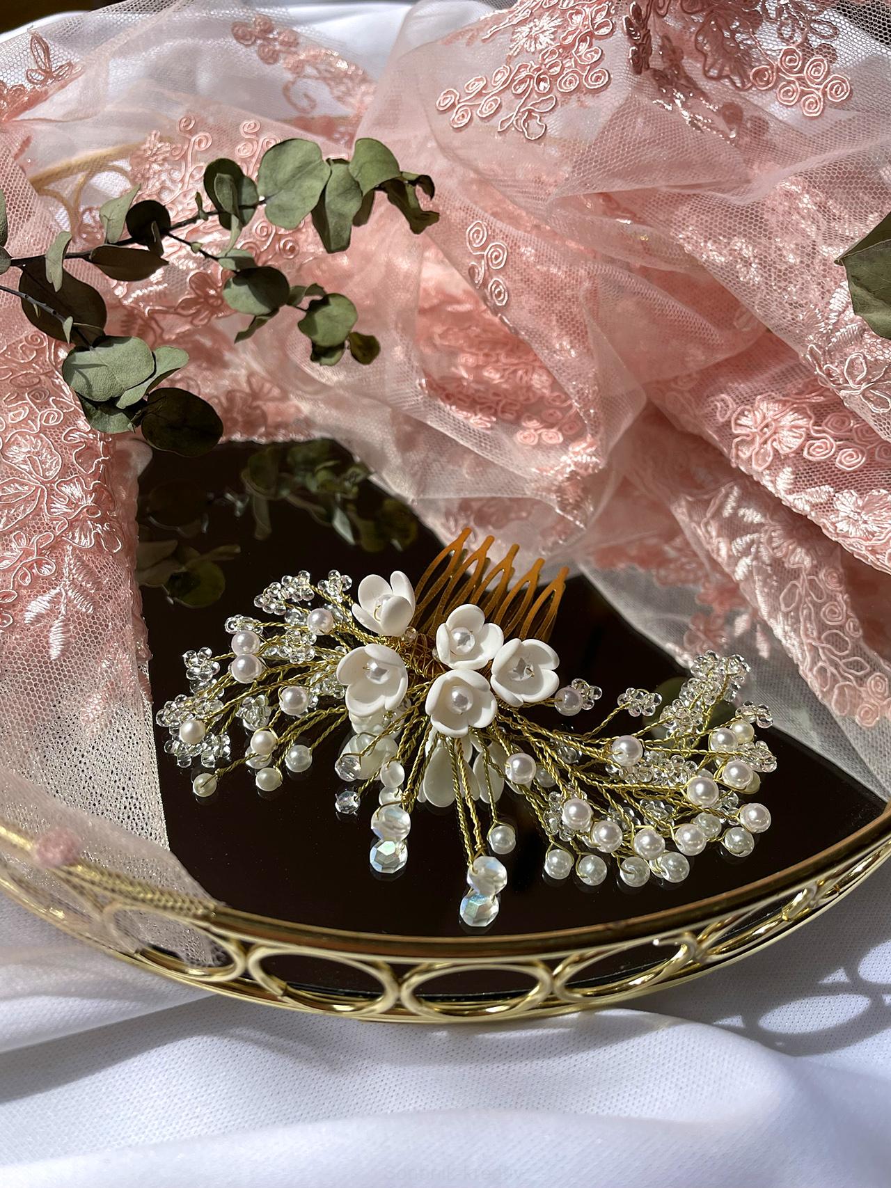 Kovový hřebínek do vlasů s ručně vyráběnými kvítky z bílé polymerové hmoty, doplněno o perličky, broušené korálky a drobný rokajl. Drátek i hřebínek jsou z bižuterního kovu zlaté barvy. Ozdůbka je vytvořena asymetricky.